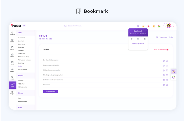 You can Bookmark your Favioute application and pages using search bookmark so you can reach to your favioute app quickly.