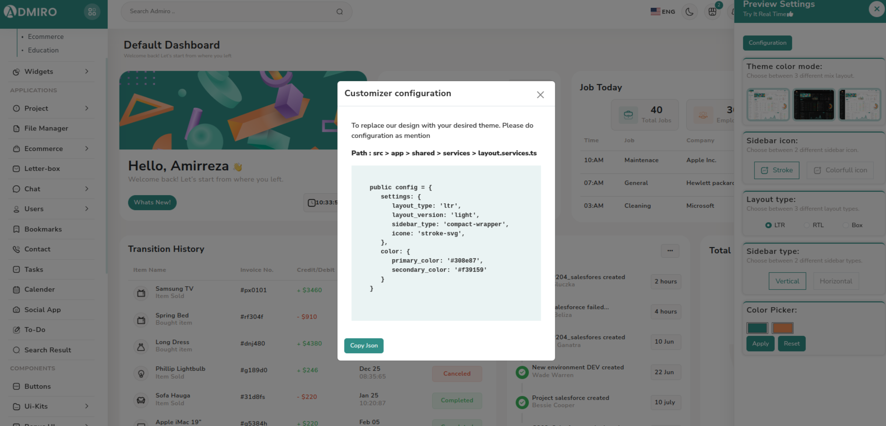 To make this theme according to your preferences we have provided a customizer bar, where you can tweak colors and layout type of the page, primary and secondary colors of the theme, and the layout of the sidebar. We have also provided a configure button from where you can copy the settings and paste in the layout.json file and get the customised layout by as the default layout.