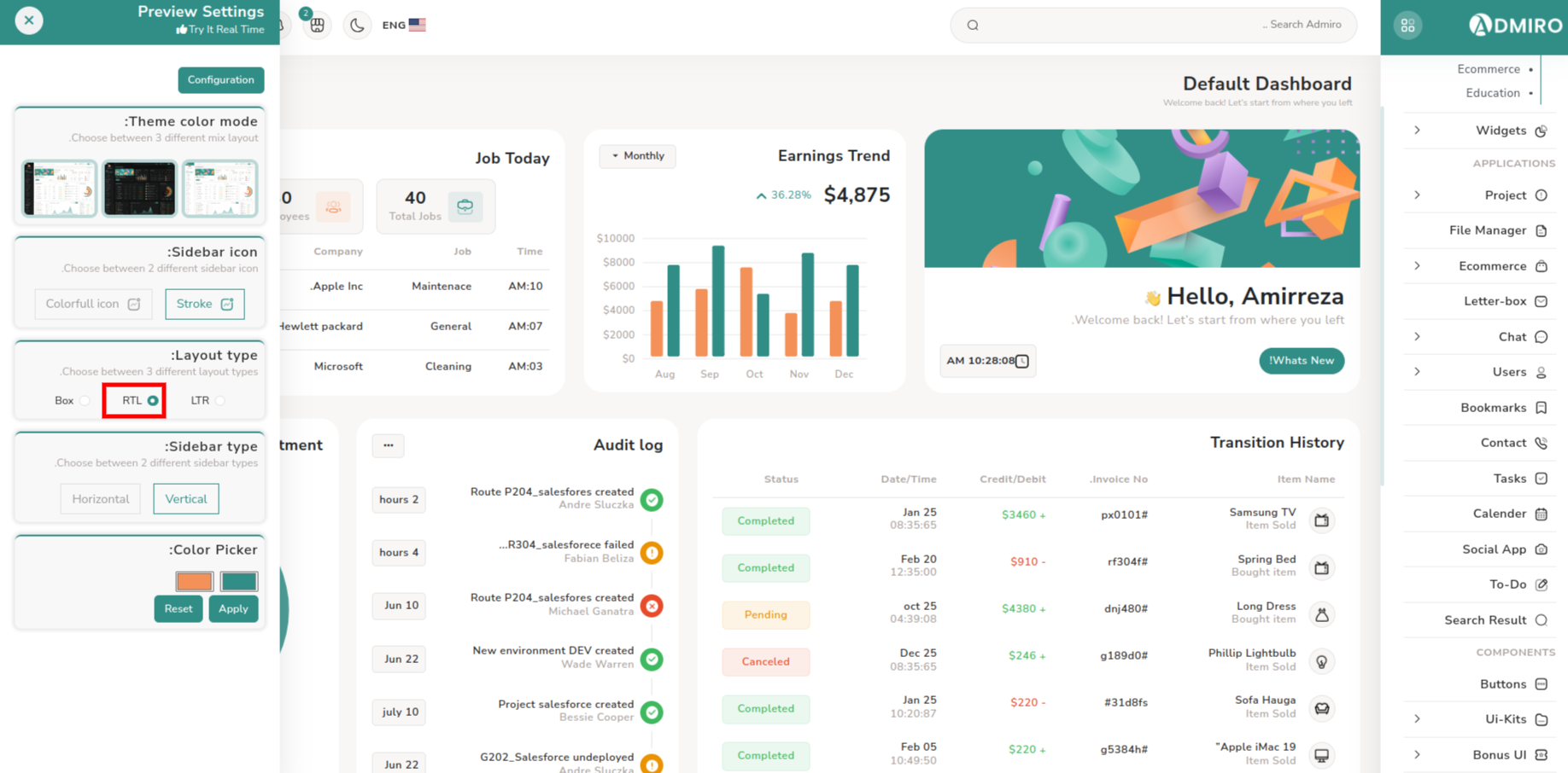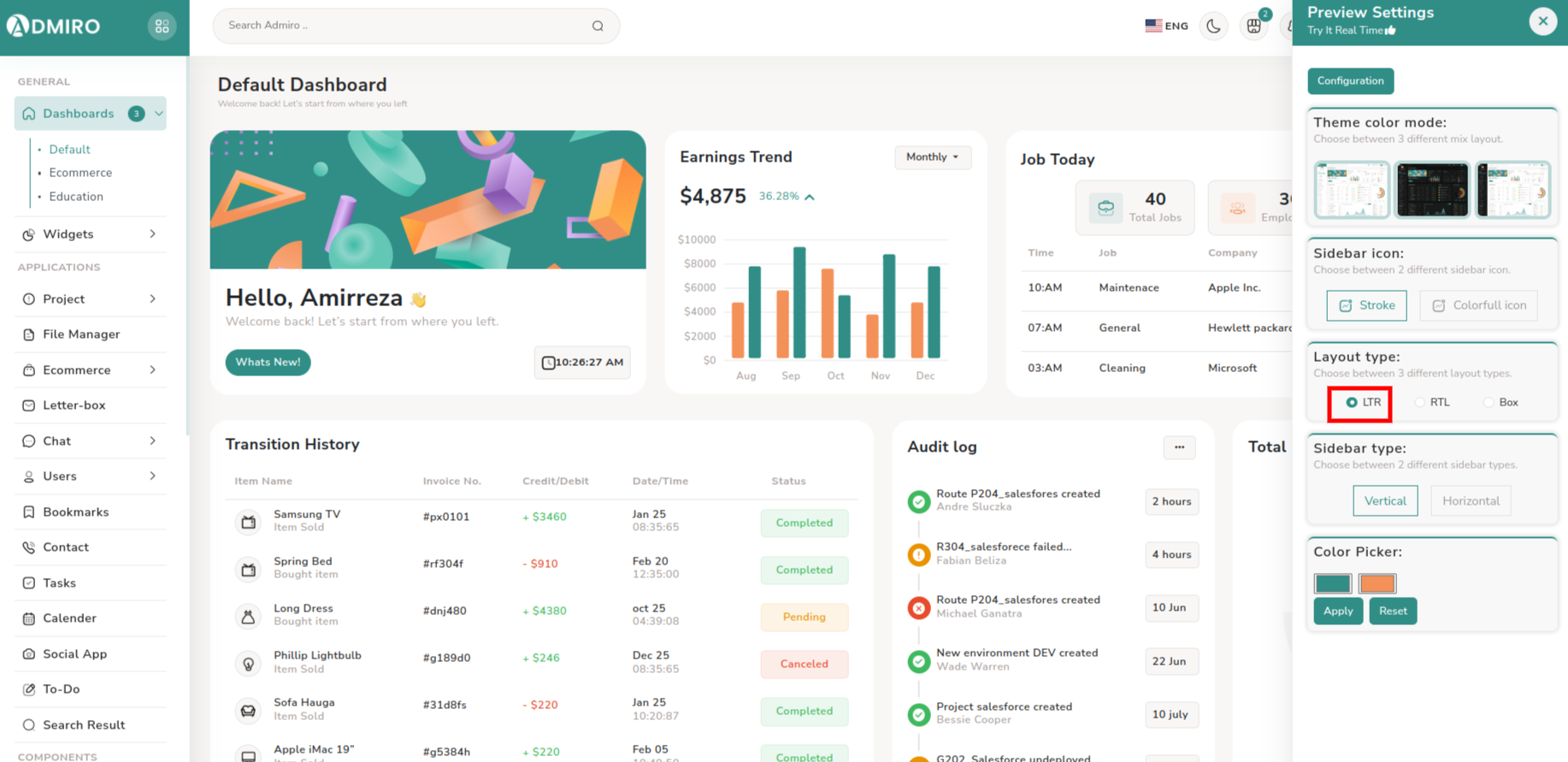 To change the layout type we change the dir value in html tag through the click event on the theme-customizer icons. And according to the dir value, content style will change. Style for all the layout are given in the layouts folder, make sure to include those files in the folder if you are planning to use different layouts.
