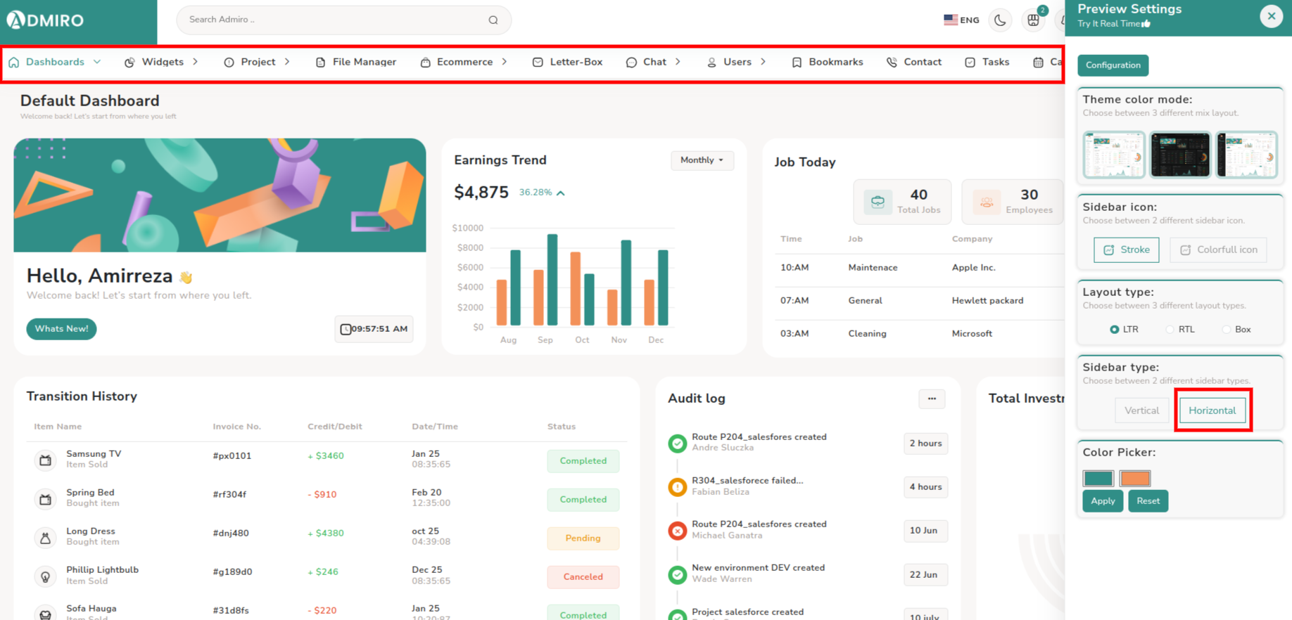 Shows the sidebar with Horizontal style.