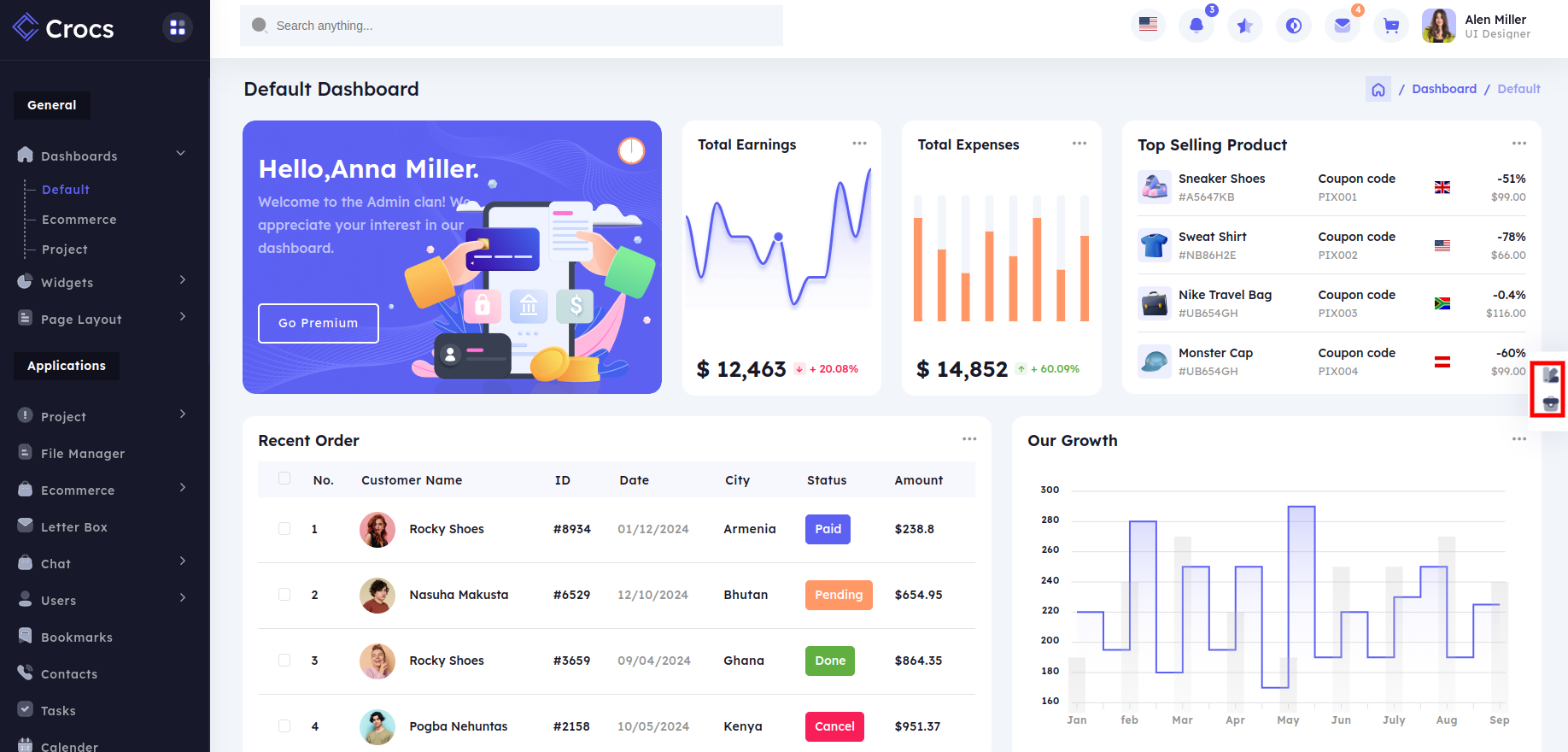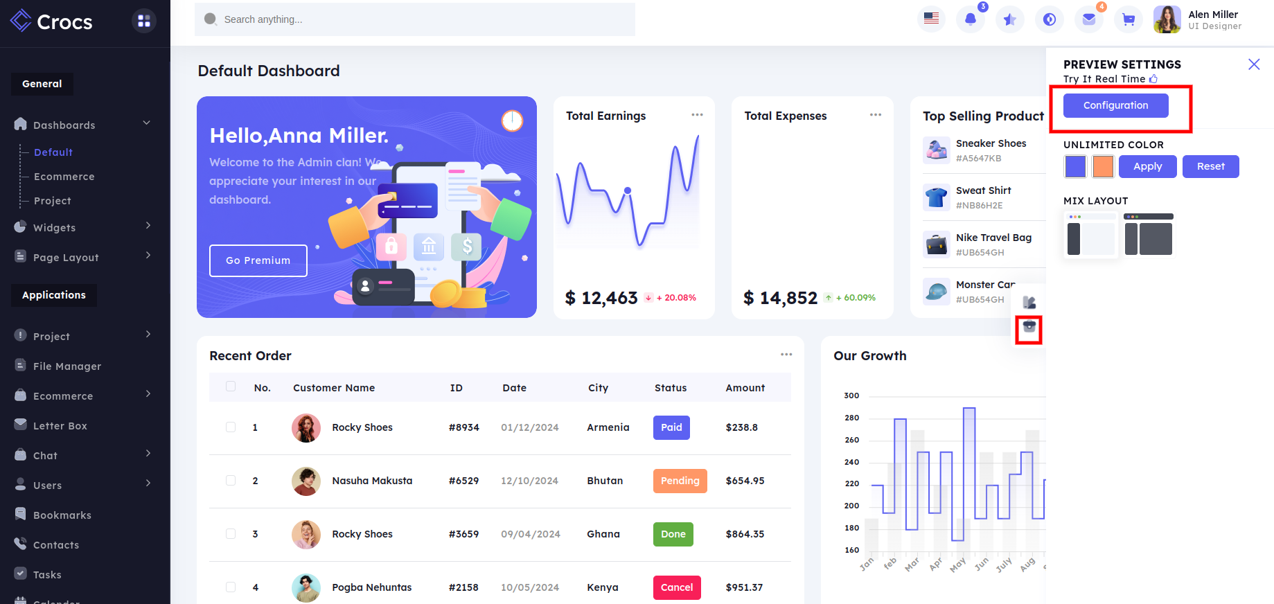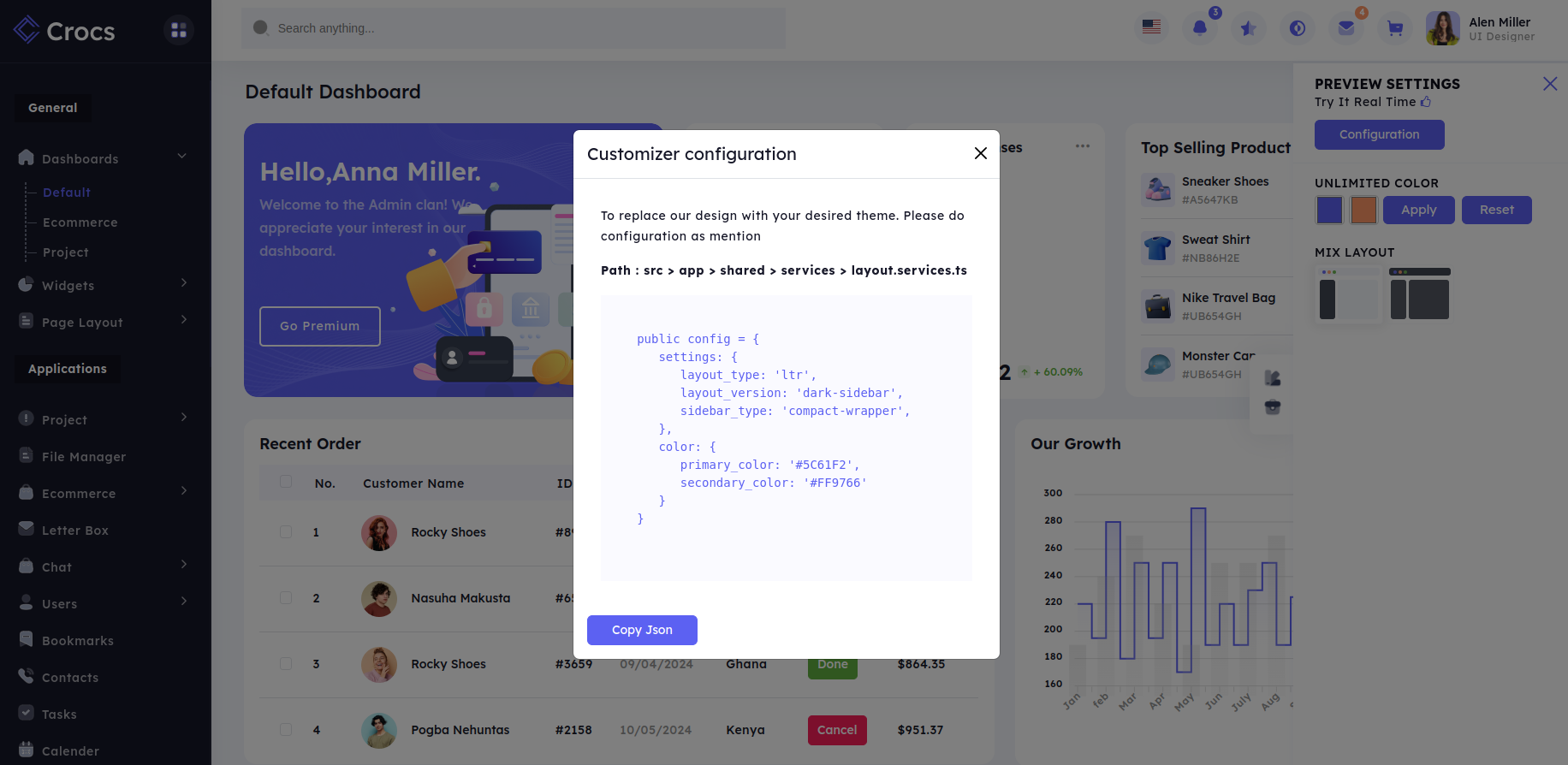 To make this theme according to your preferences we have provided a customizer bar, where you can tweak colors and layout type of the page, primary and secondary colors of the theme, and the layout of the sidebar. We have also provided a configure button from where you can copy the settings and paste in the layout.json file and get the customised layout by as the default layout.