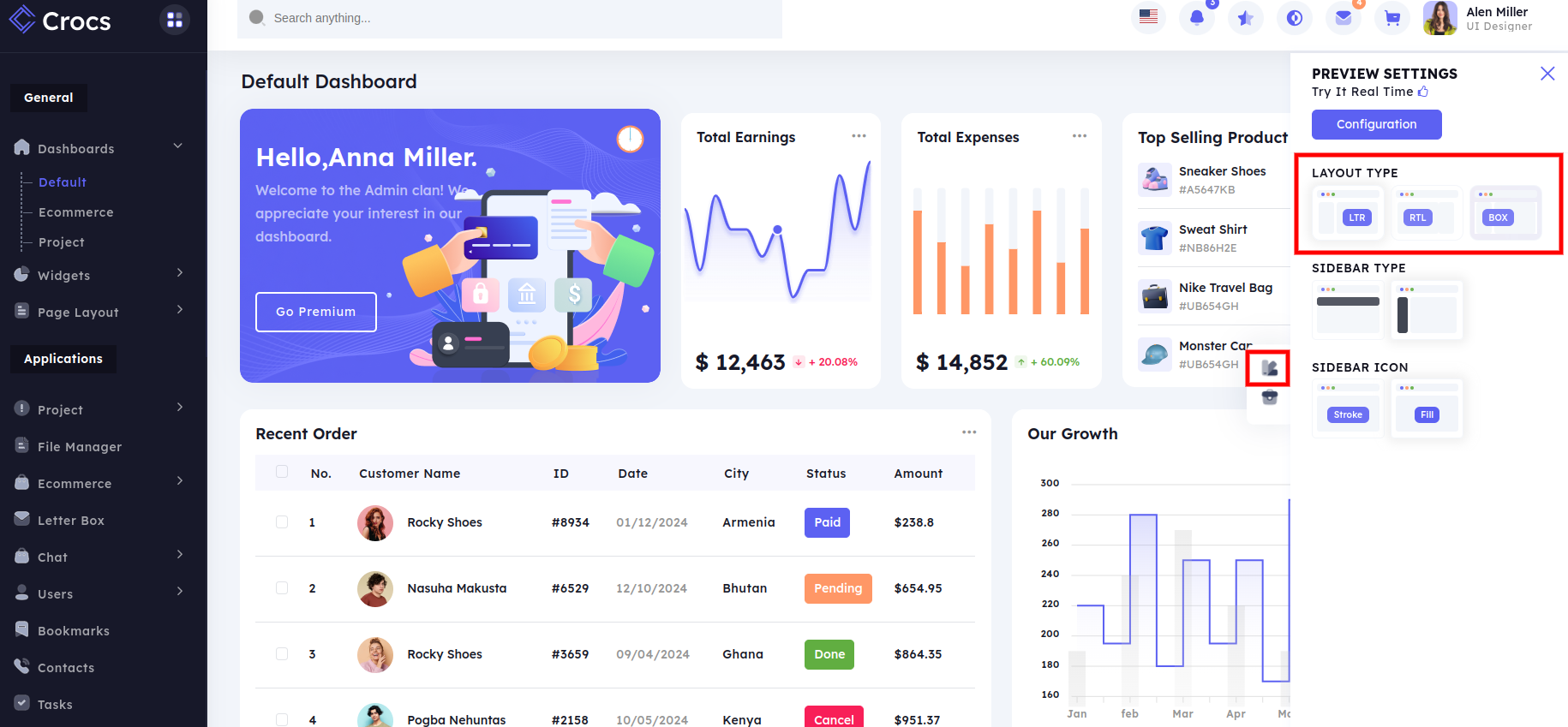 To change the layout type we change the dir value in html tag through the click event on the theme-customizer icons. And according to the dir value, content style will change. Style for all the layout are given in the layouts folder, make sure to include those files in the folder if you are planning to use different layouts.