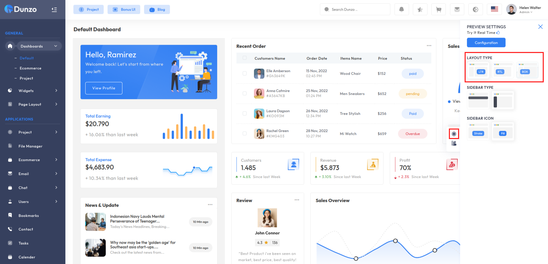 To change the layout type we change the dir value in html tag through the click event on the theme-customizer icons. And according to the dir value, content style will change. Style for all the layout are given in the layouts folder, make sure to include those files in the folder if you are planning to use different layouts.