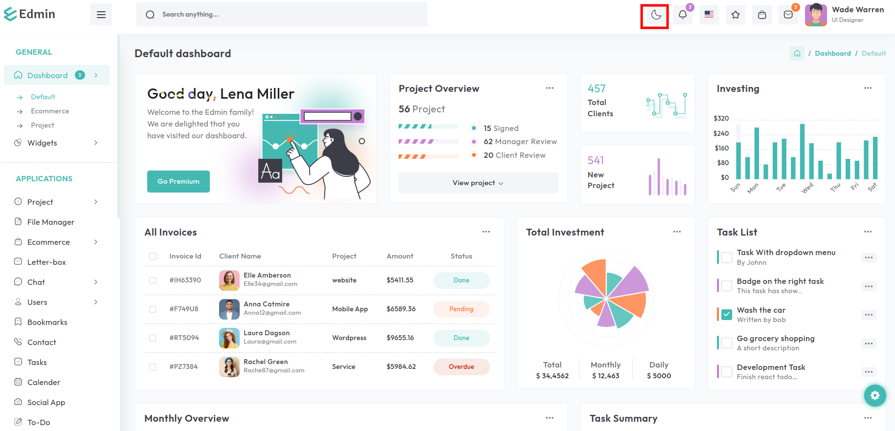 Toggle Dark Mode by clicking on the moon icon in the header.