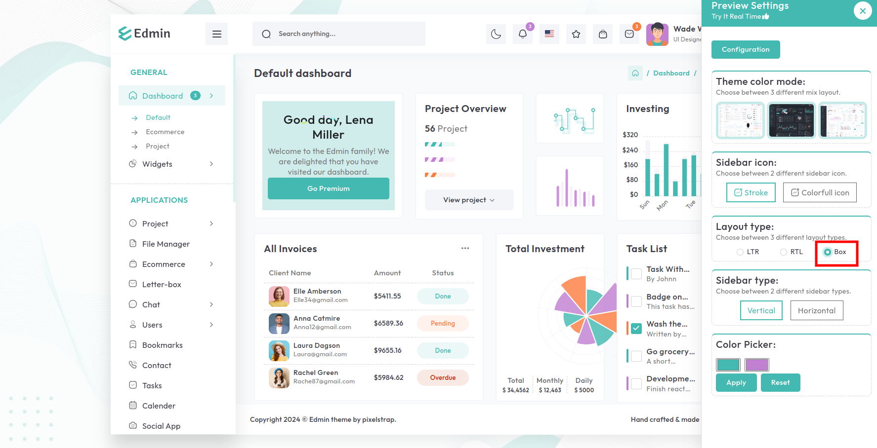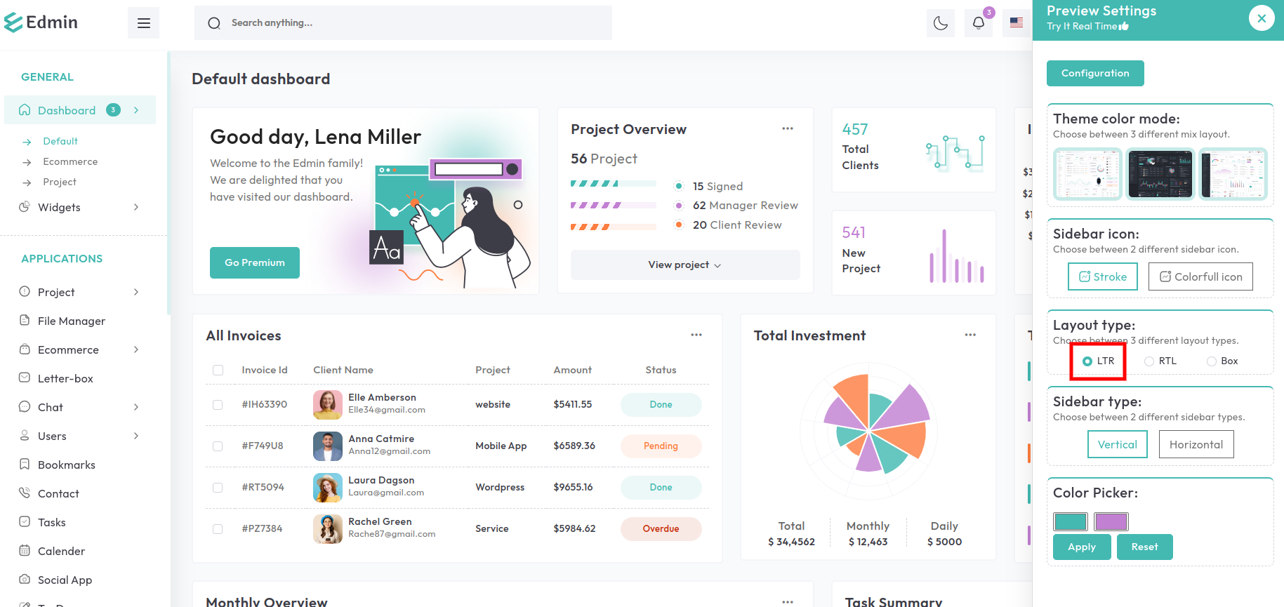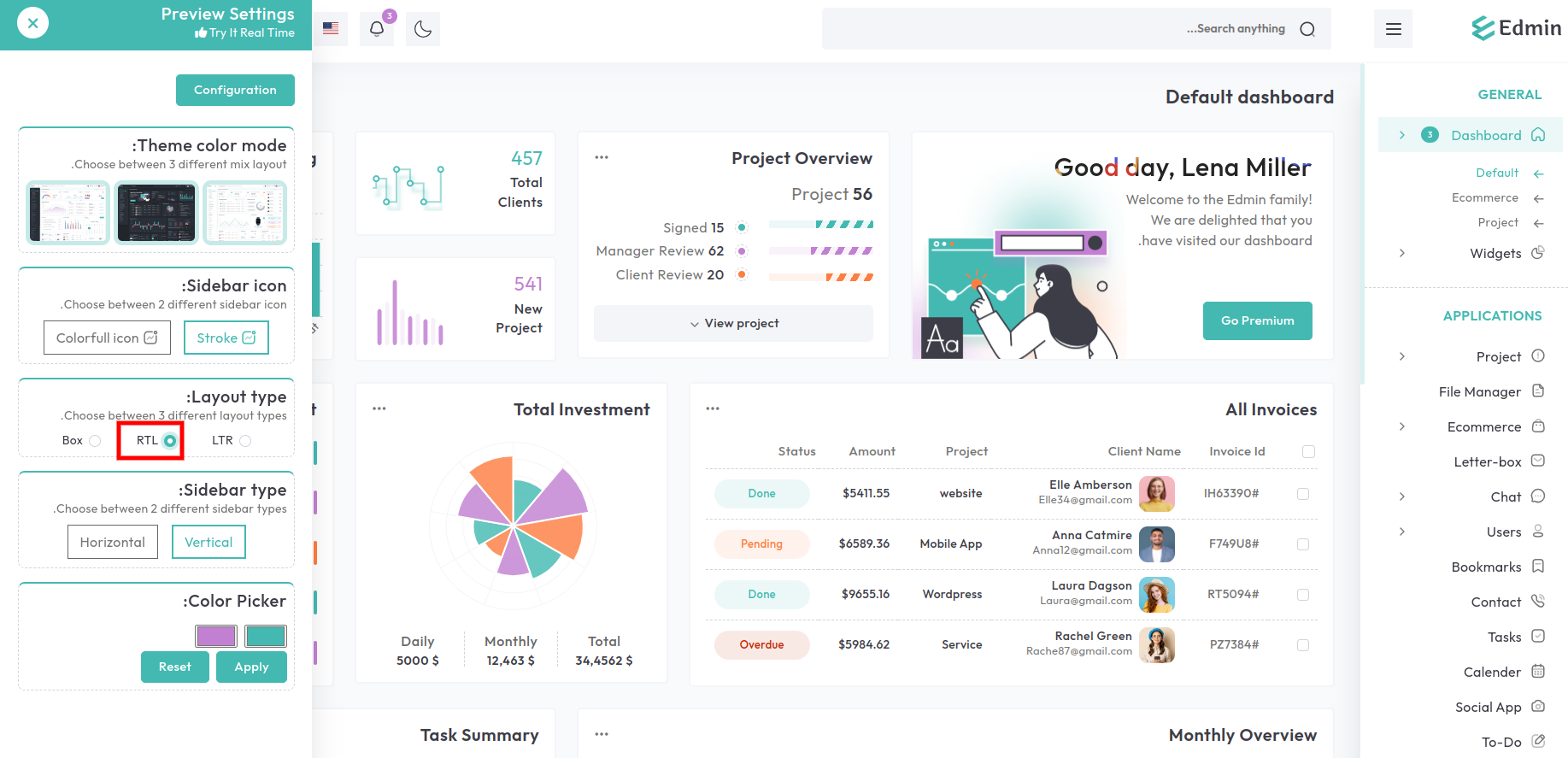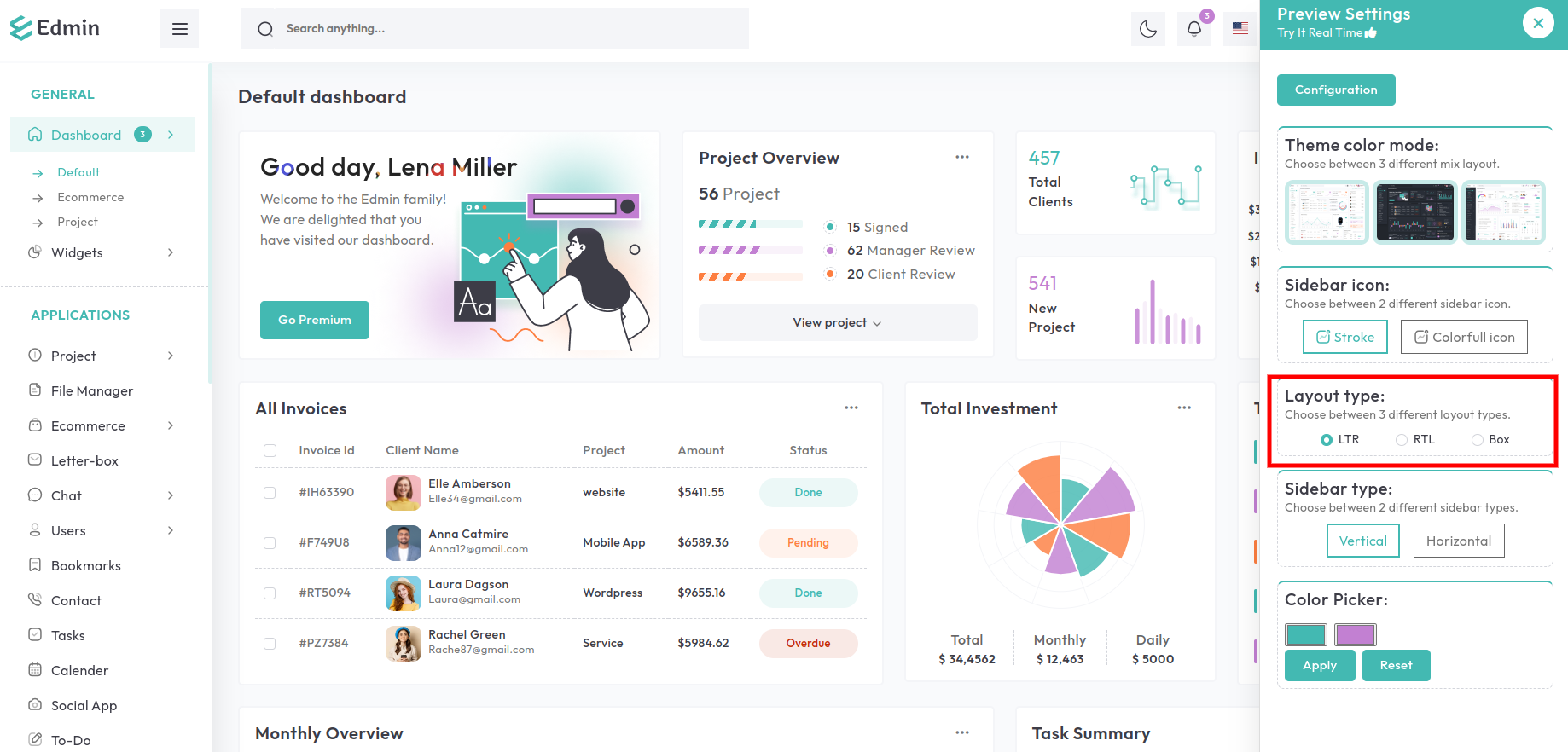 To change the layout type we change the dir value in html tag through the click event on the theme-customizer icons. And according to the dir value, content style will change. Style for all the layout are given in the layouts folder, make sure to include those files in the folder if you are planning to use different layouts.