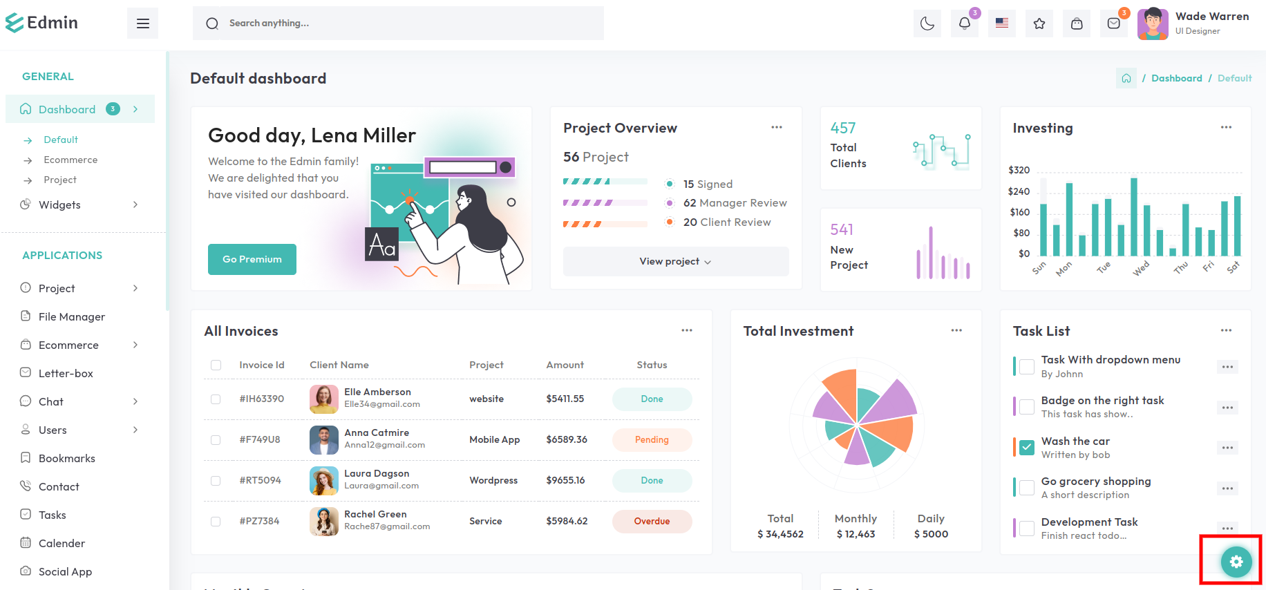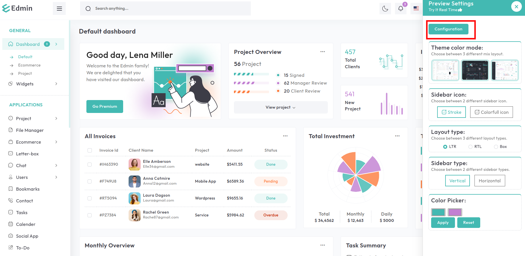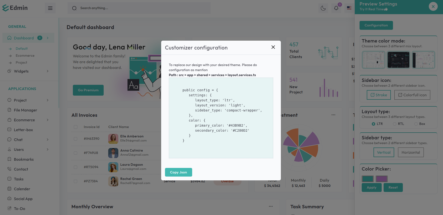 To make this theme according to your preferences we have provided a customizer bar, where you can tweak colors and layout type of the page, primary and secondary colors of the theme, and the layout of the sidebar. We have also provided a configure button from where you can copy the settings and paste in the layout.json file and get the customised layout by as the default layout.