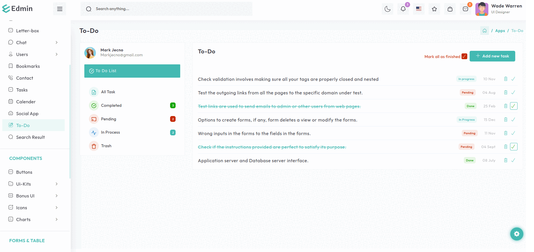 Below link takes you to the design of the application, but it is just the design, data won't be stored anywhere, if you reload the page you will notice that changes will be gone. You can store and modify the todo list by storing it in the database of your liking. To make it easier of the developers we have already give the to-do application integrated with firebase-firestore.