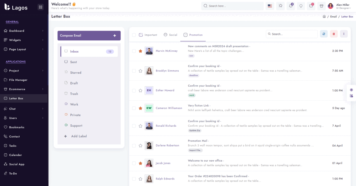 To keep things professional you can add integrate the Letter Box application with this theme, to share the important information with your colleagues. We have provided a design for the Letter Box application, you can use it and build a fully functional e-mail application.