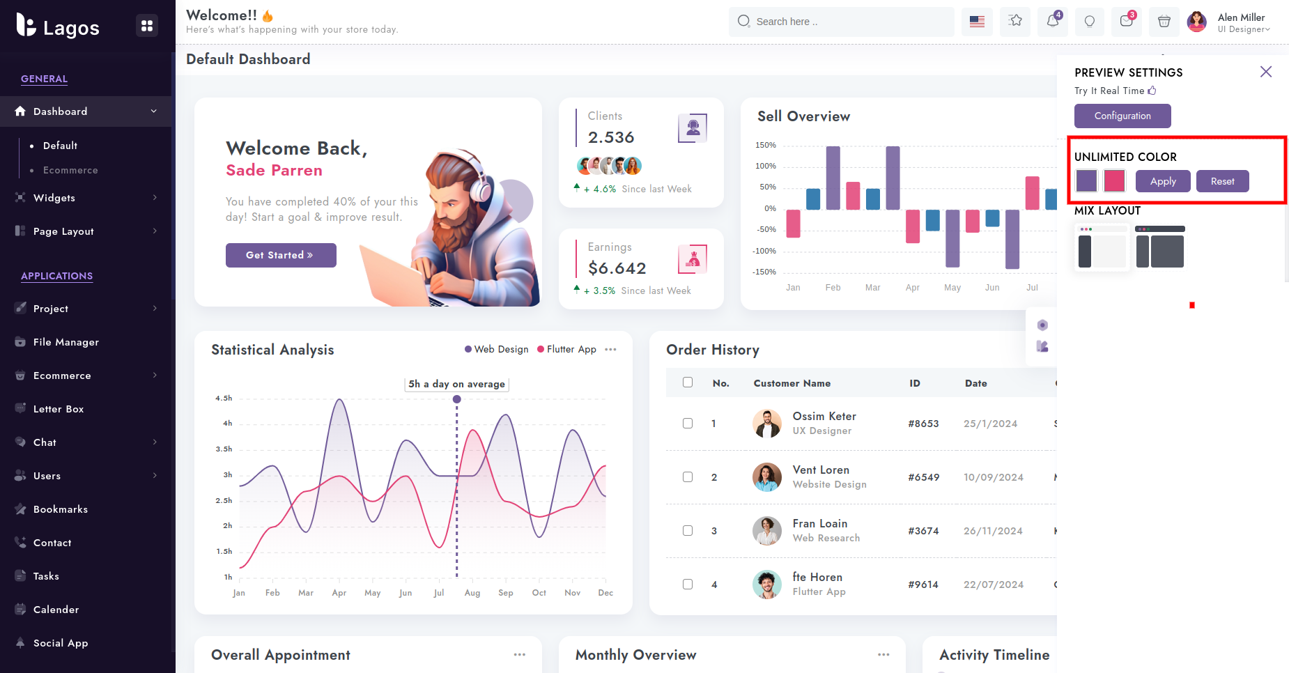 To try different color combinations we have provided a color selector so that you could tweak the colors are per your needs and from the theme itself and when you are satisfied with the changed color, you can set the primary and secondary color in the scss file.