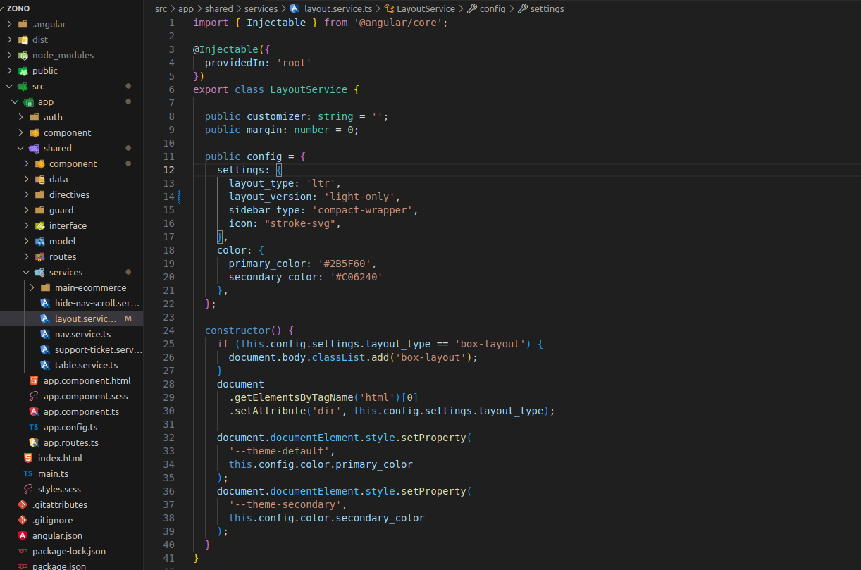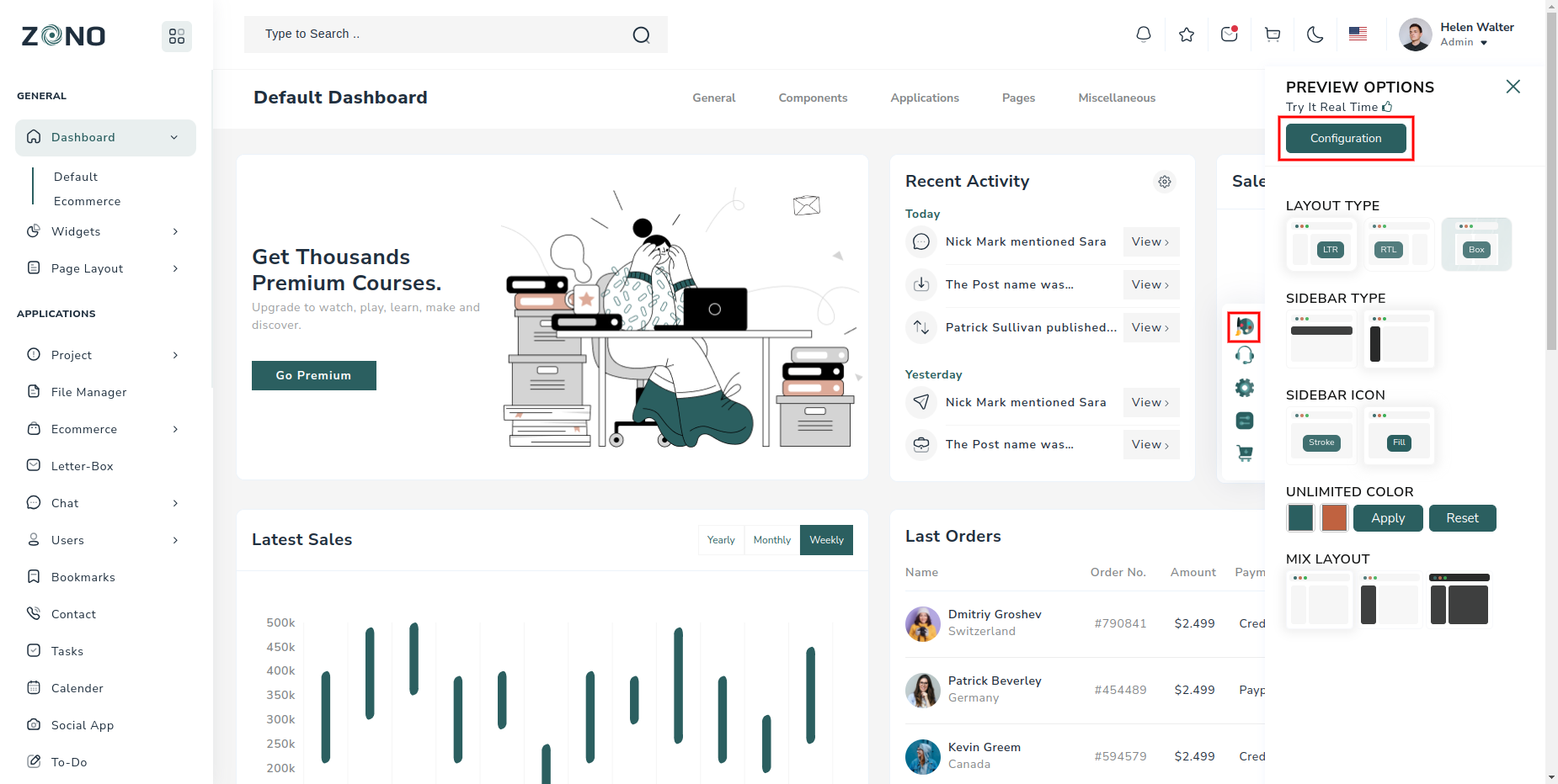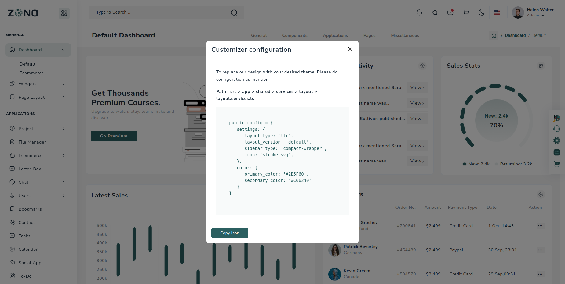 To make this theme according to your preferences we have provided a customizer bar, where you can tweak colors and layout type of the page, primary and secondary colors of the theme, and the layout of the sidebar. We have also provided a configure button from where you can copy the settings and paste in the layout.json file and get the customised layout by as the default layout.