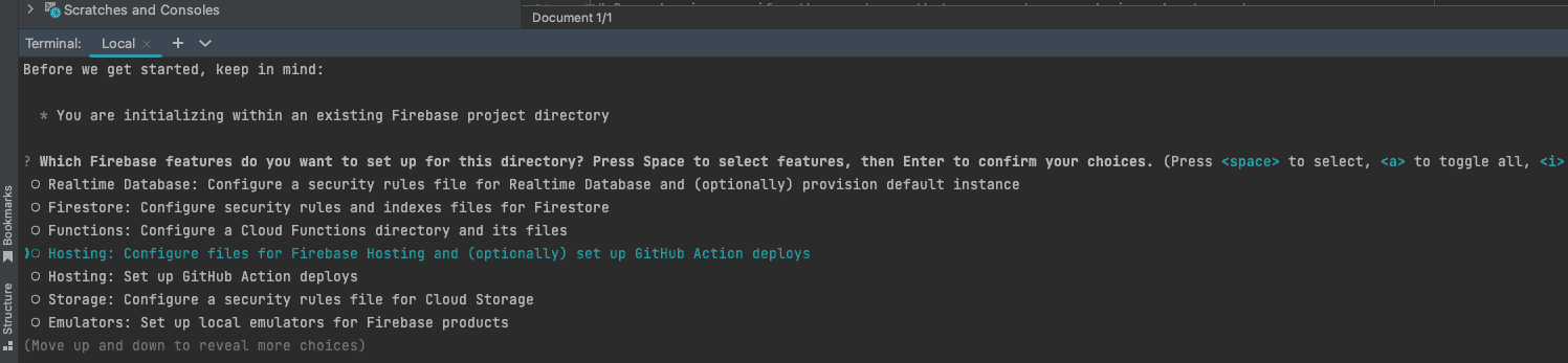 firebase init - Use the arrow keys to navigate the cursor to Hosting and hit the spacebar to