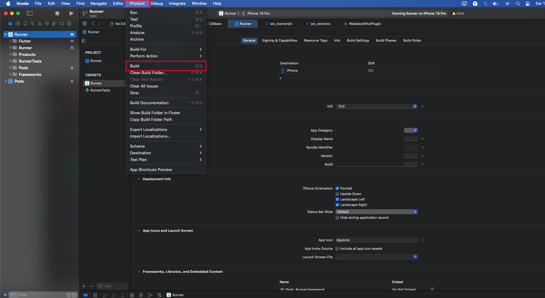 - Click on Product > Build from the top menu bar (or use the shortcut Cmd + B).