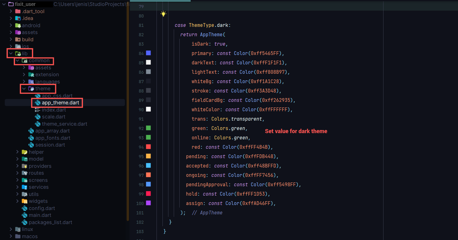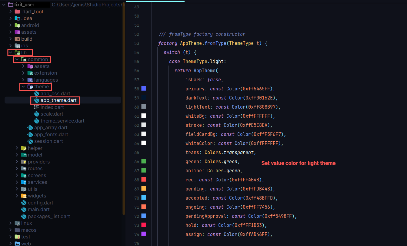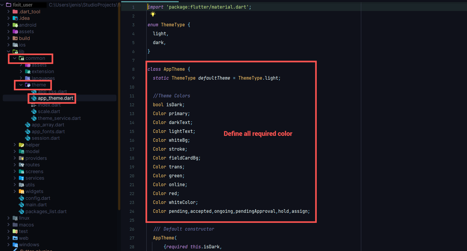 - Open your project, go to lib -> main.dart we already apply for theme for dark mode and light mode