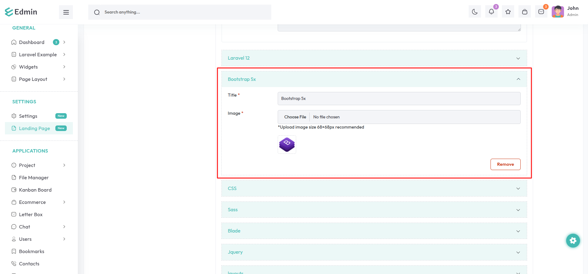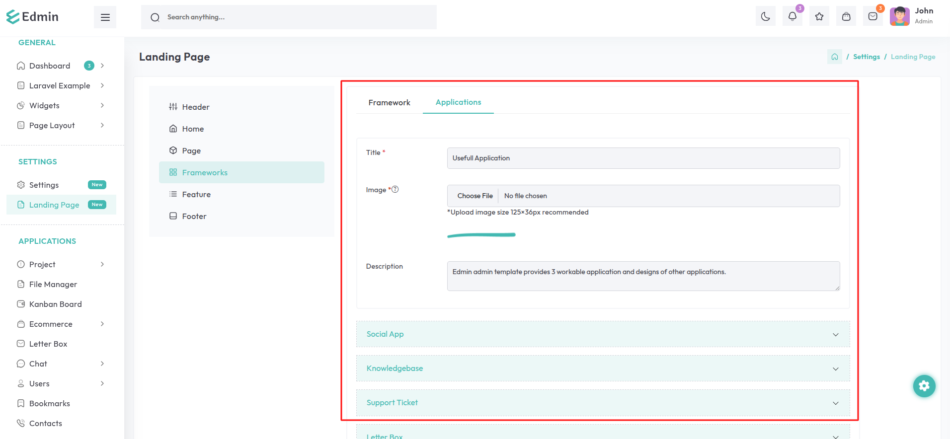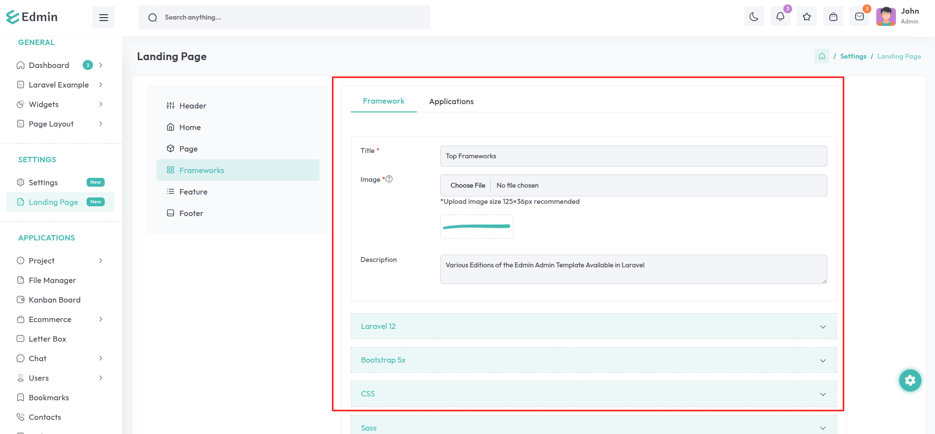 Navigate to the Landing Page option in the sidebar, select the Frameworks tab, and then choose the Framework sub-tab.