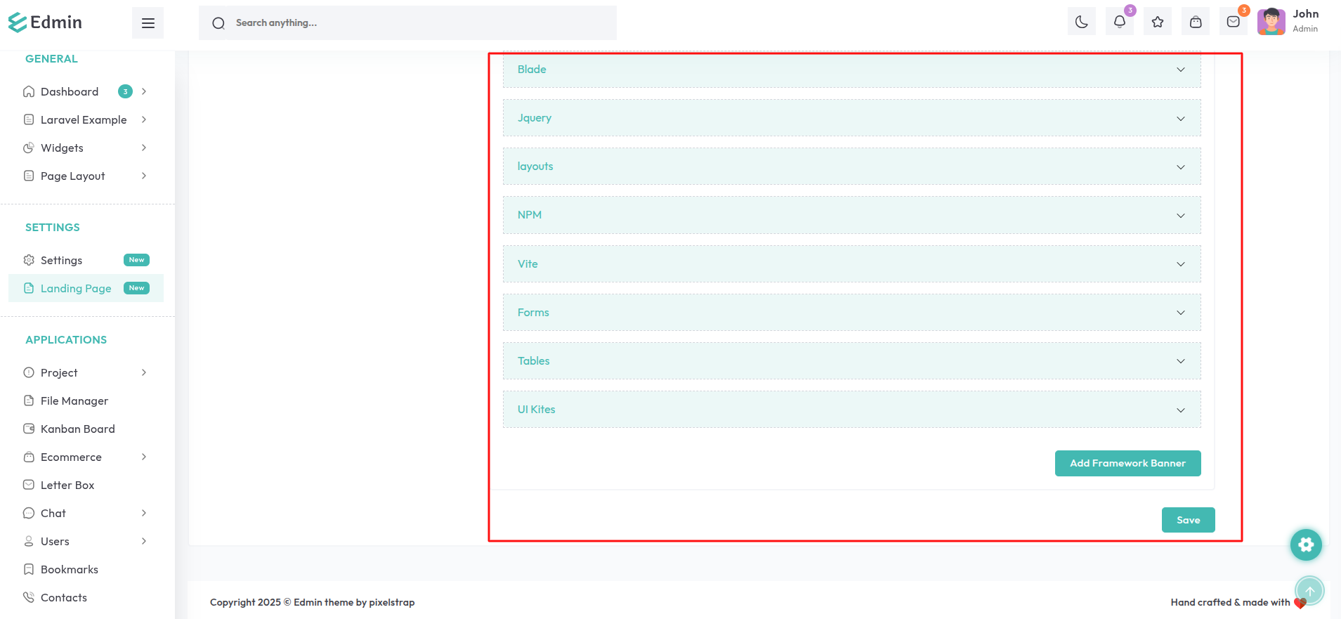 Add Framework Banner Button: This button is used to add new framework banners to the Framework section, each with customizable details.