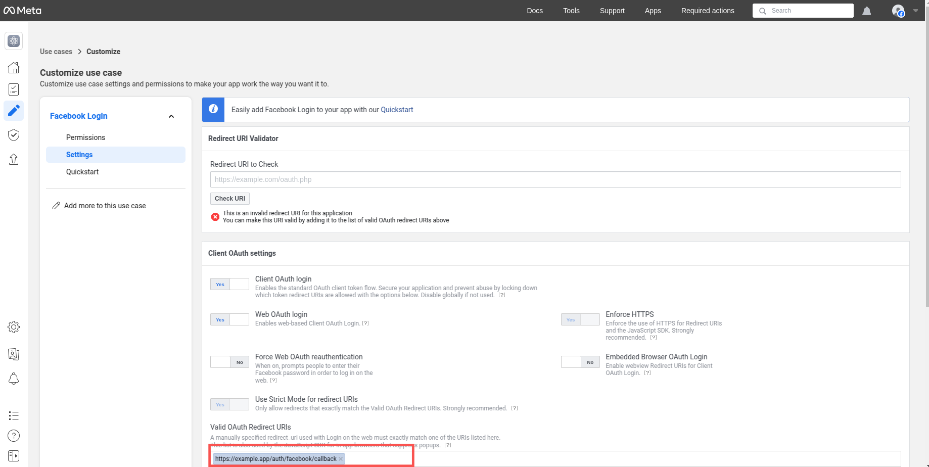 11. In the Use Cases section, go to Settings, and then add the Redirect URL under Valid OAuth Redirect URIs. then Click the Save changes button.