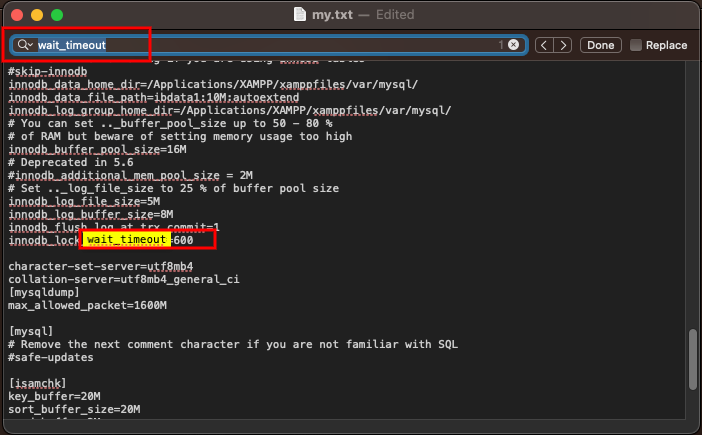 - In the Text Editor, find max_allowed_packet and increase 100M, to allow a maximum data size 100M sent to the MySQL server.