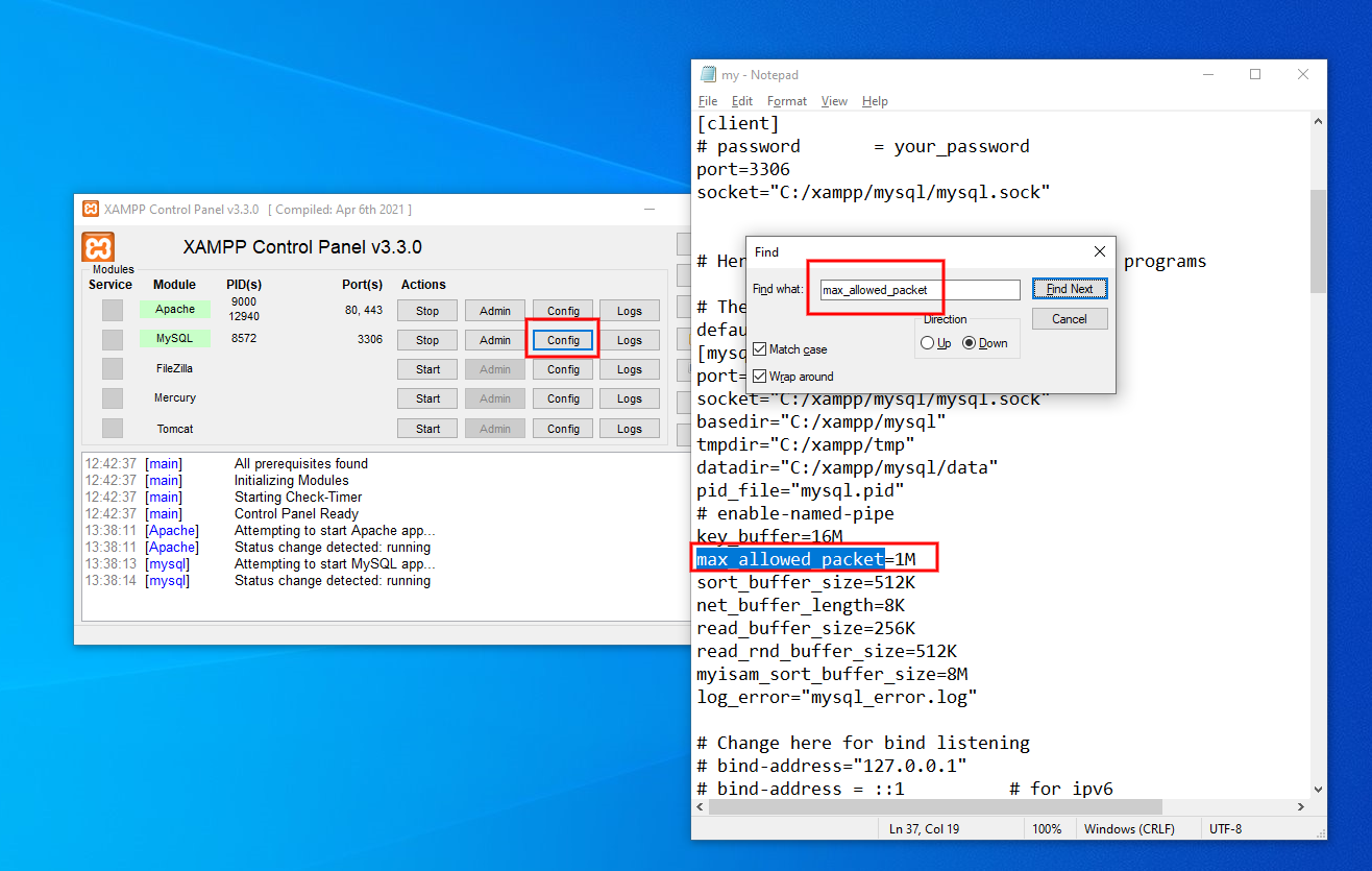 - In the Text Editor, find max_allowed_packet and increase 100M, to allow a maximum data size 100M sent to the MySQL server.