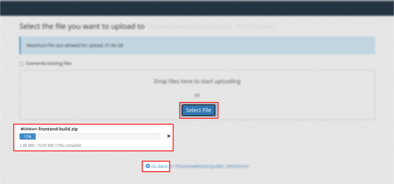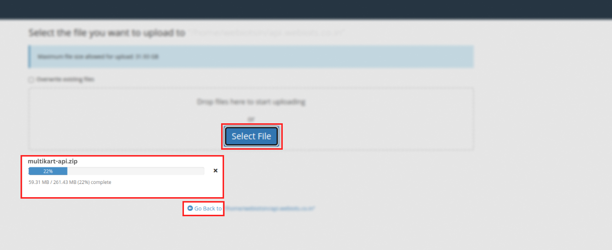 - Zip all files and folders in the multikart-api folder and upload it to your cPanel server.