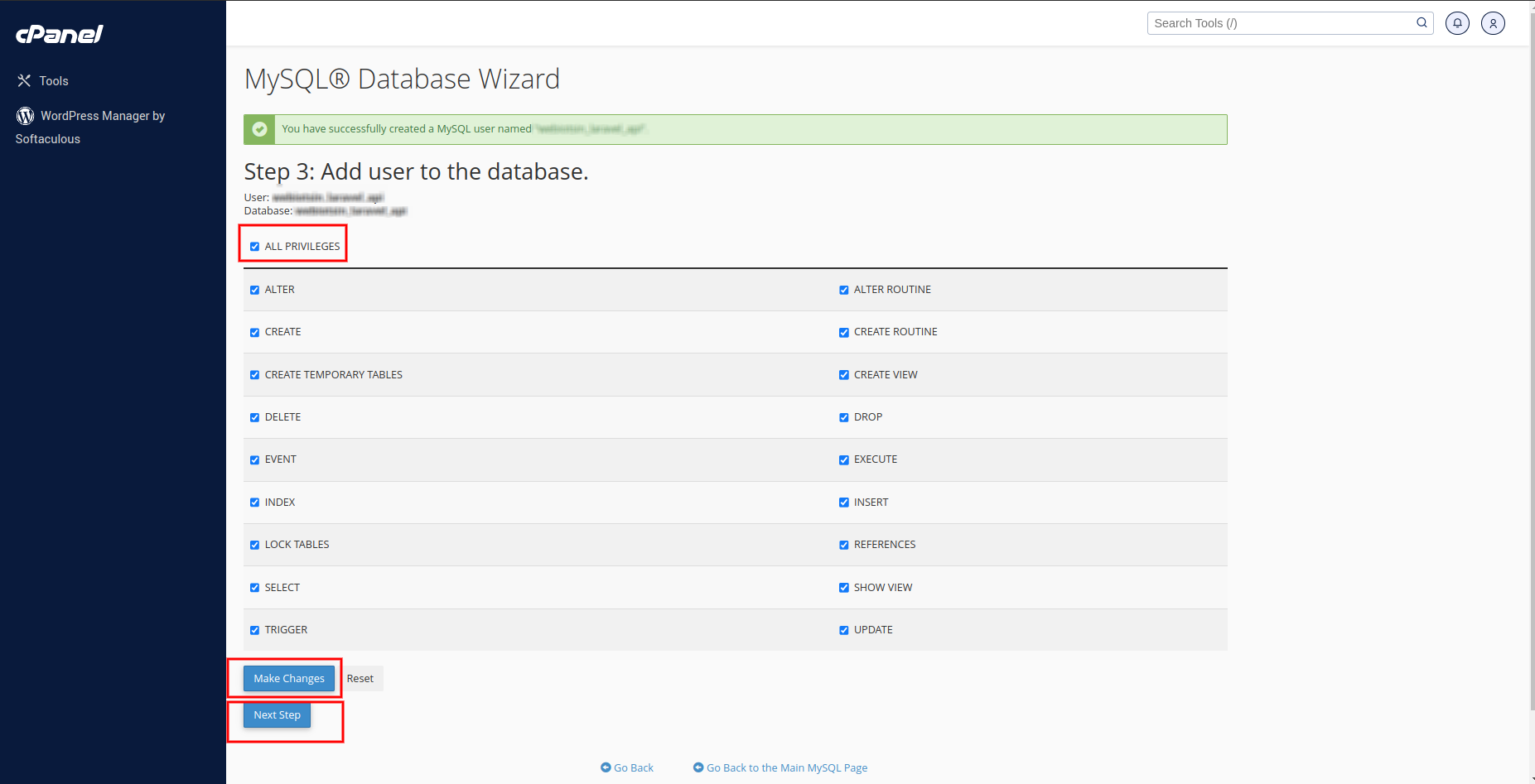 - Add a user to the database, give them all the necessary permissions, and then click 'Make Changes.' After that, click 'Next Step.