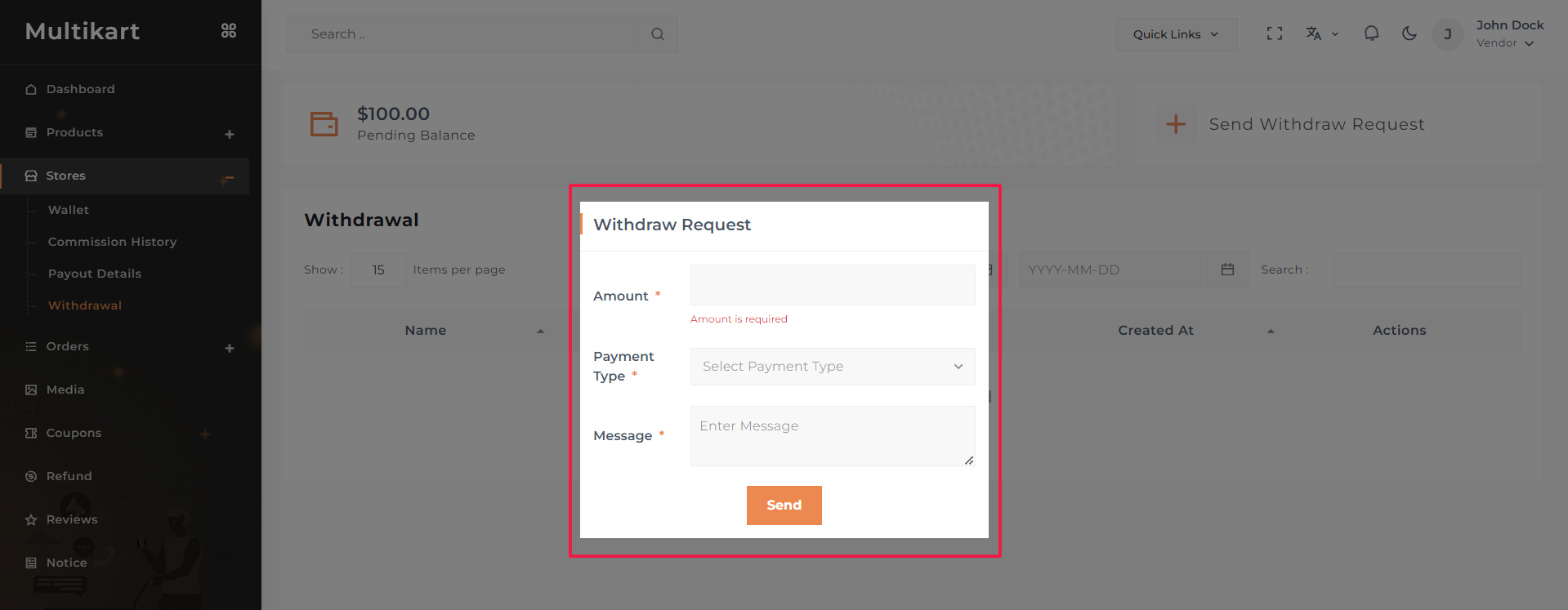 Also, you can view your withdrawal history in the table below. Admin will approve or reject requests.