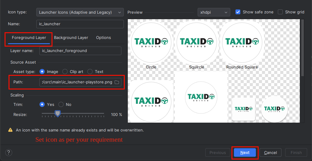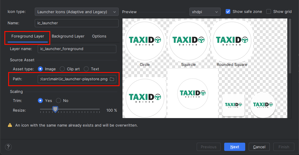 - Choose your app icon image path in the Foreground Layer from the pop-up that appears.