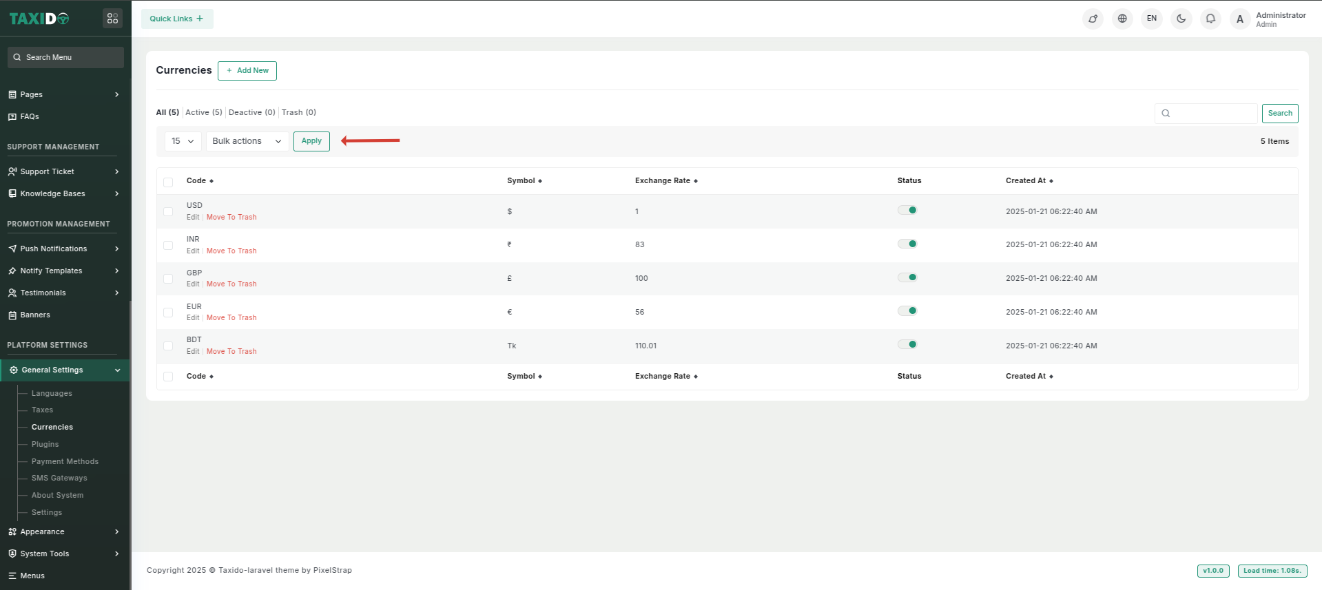 - Status: Activate or deactivate specific currencies. Deactivated currencies will not appear as options in the system.