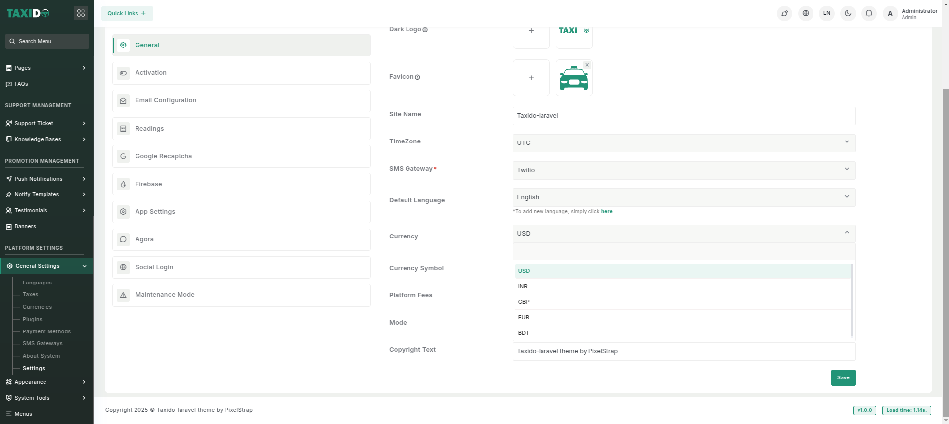 The Currency setting lets you choose the default currency for your system. Remember to click Save after selecting.