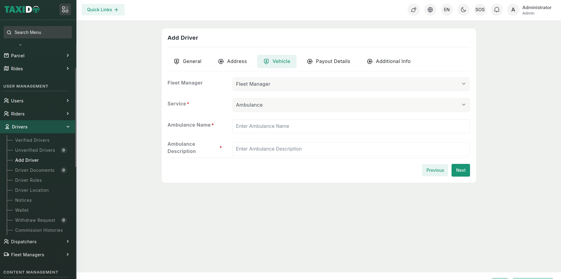 - When creating a driver for the ambulance, add the ambulance name and description, then associate the ambulance with that specific driver.