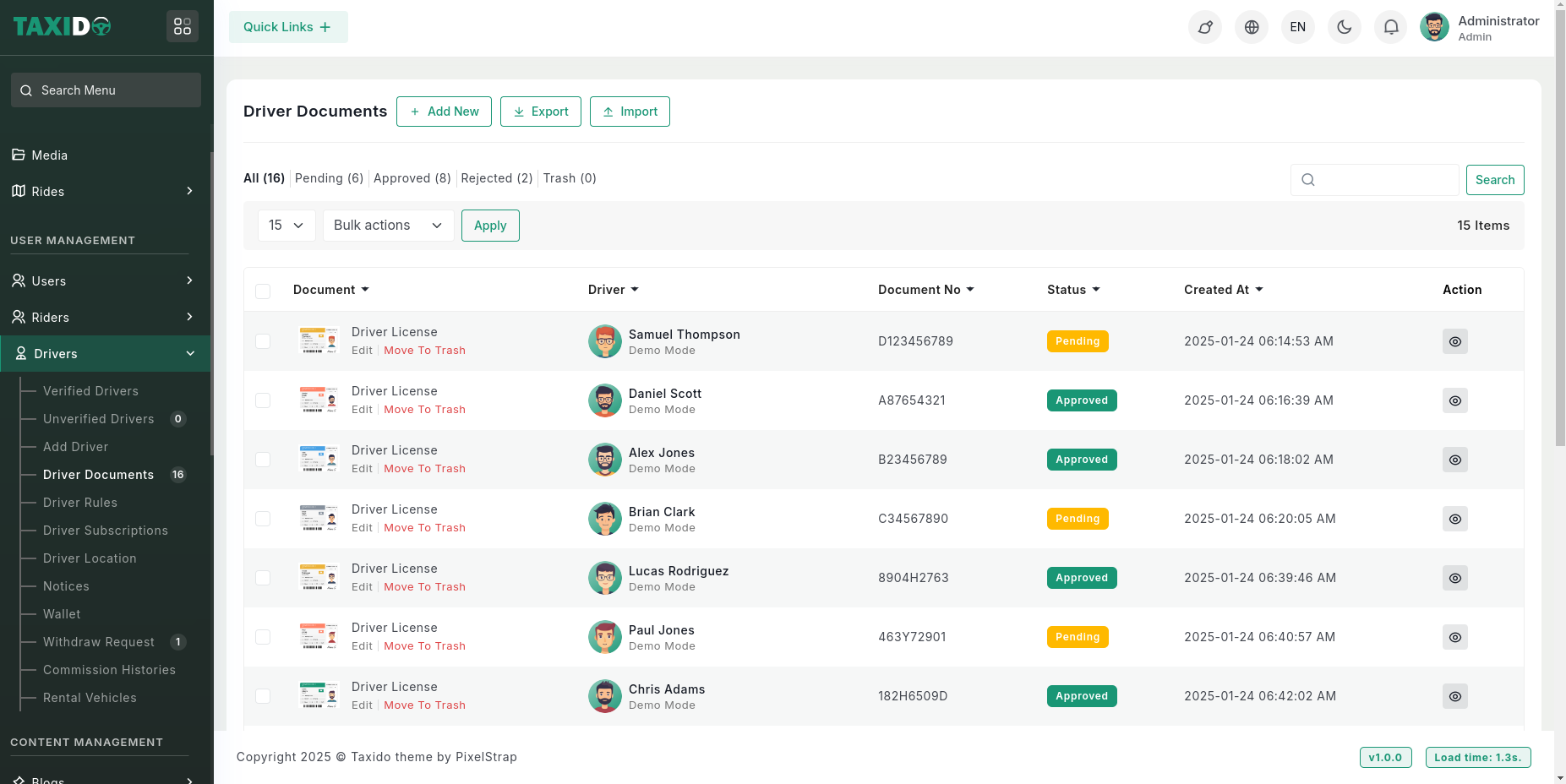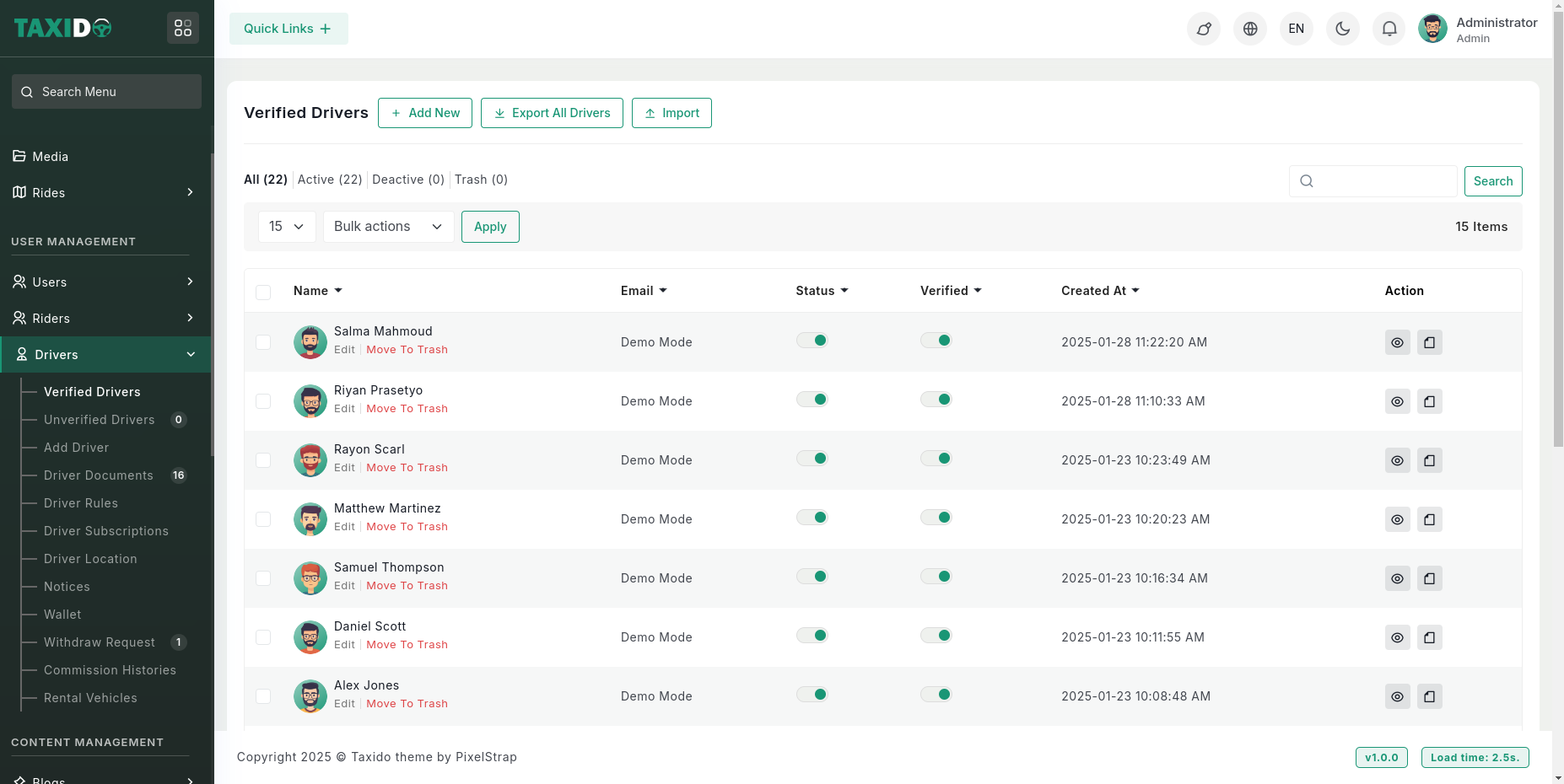 - Unverified Drivers are drivers who have not yet undergone the verification process. Their status remains unverified until manually approved by the admin. Admin verification involves reviewing uploaded documents before approval.
