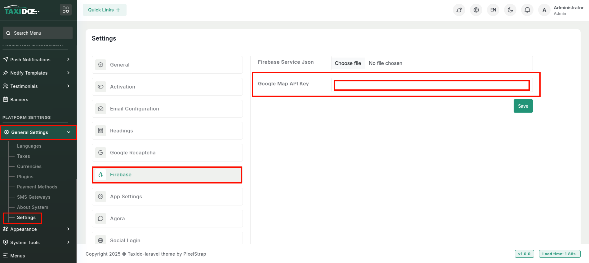 Once the Places API is enabled, access the ADMIN PANEL (Laravel). From the left-side menu,