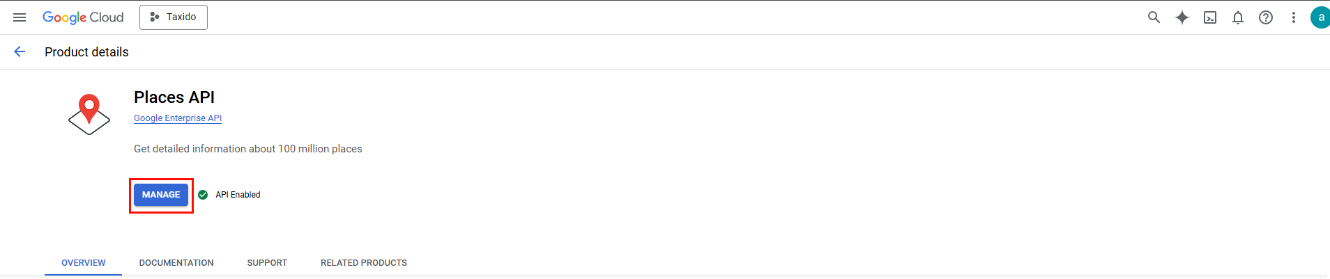 Alternatively, you can visit the Google API Library, choose your project, and select the Places