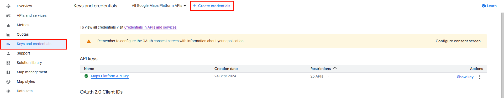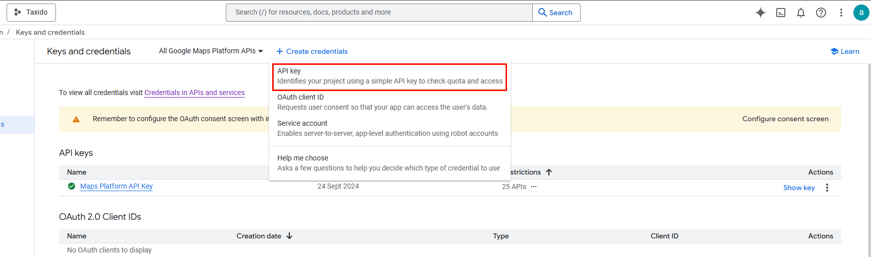 - In the top menu, click on + CREATE CREDENTIALS