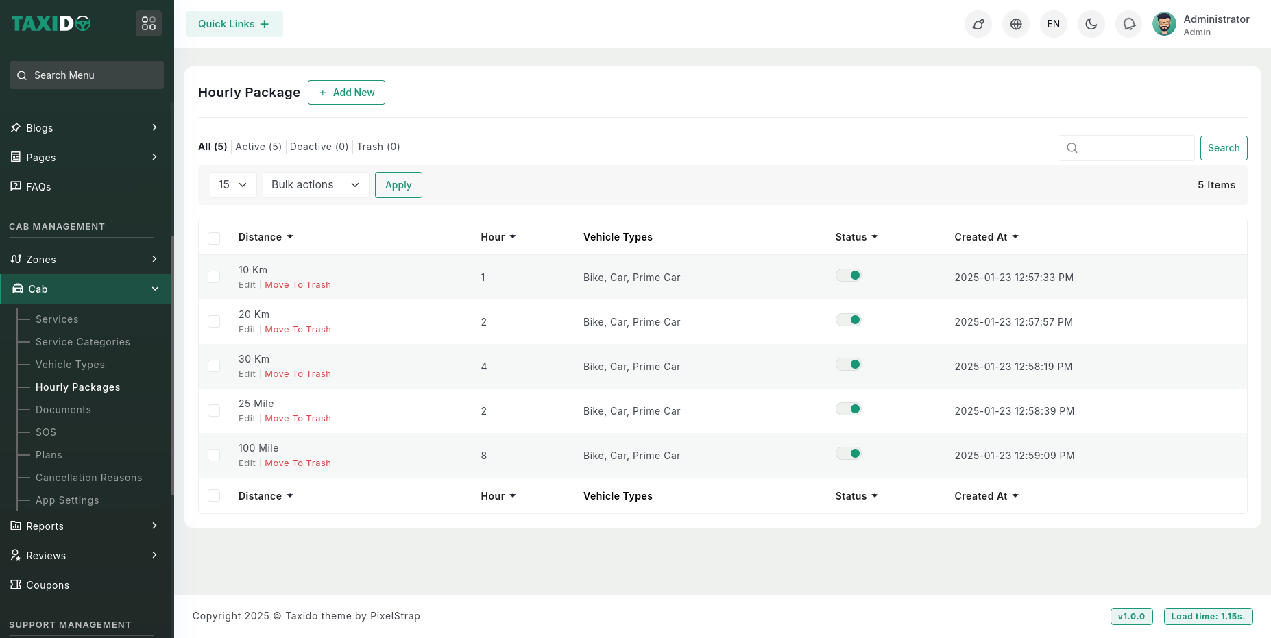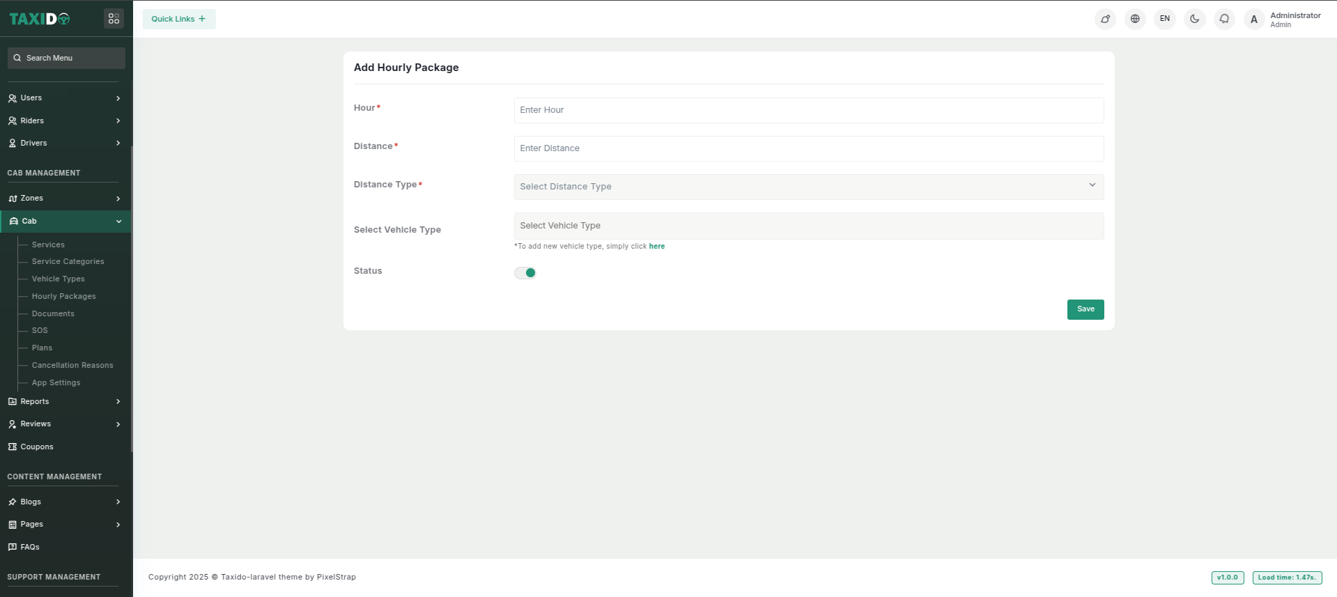 - The Add New: button for Hourly Package allows the user to create and add a new package that specifies hourly rates for services. By clicking this button, the user can enter details like the hour, distance, distance type, vehicle type and status with the hourly service package, providing flexibility in offering services based on time.