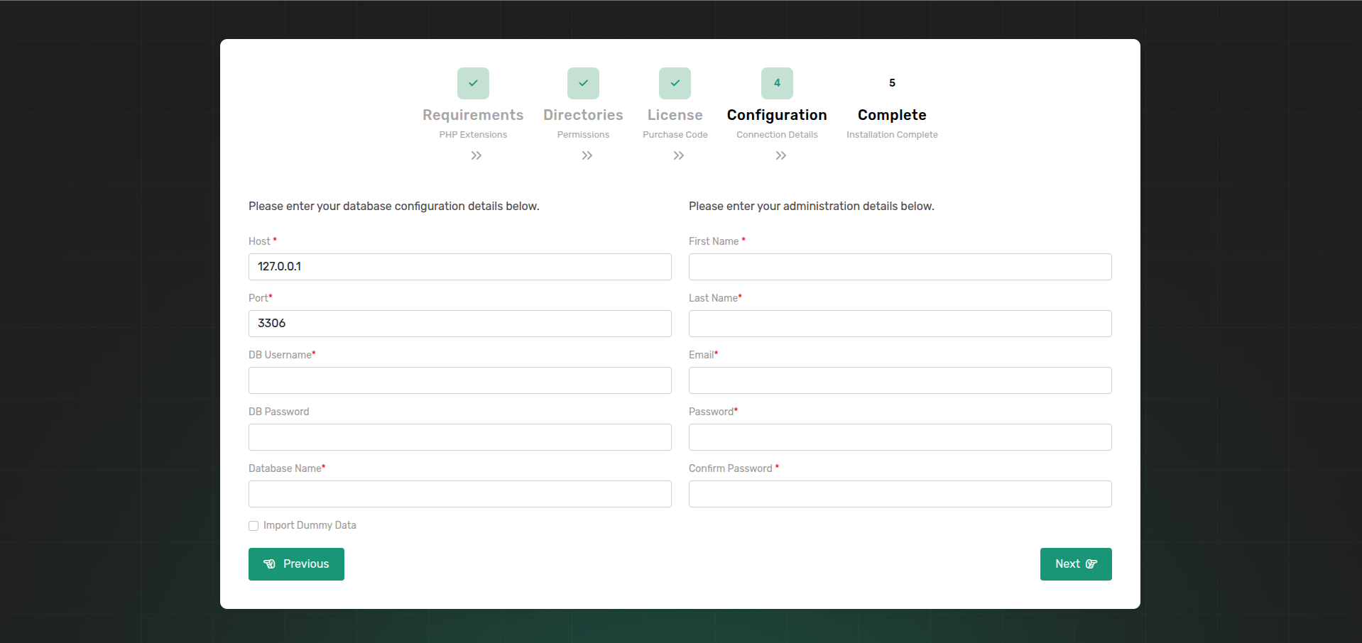 - To import sample data, select "Import Dummy Data". After selecting this option, the administration details will be hidden. Click the "Next" button to the sample data will be imported.