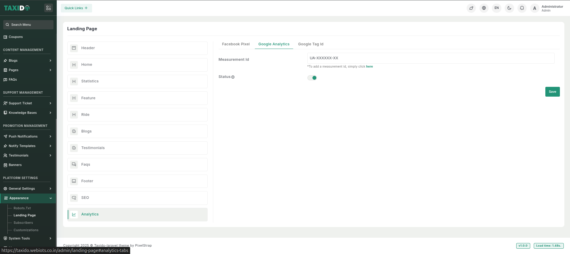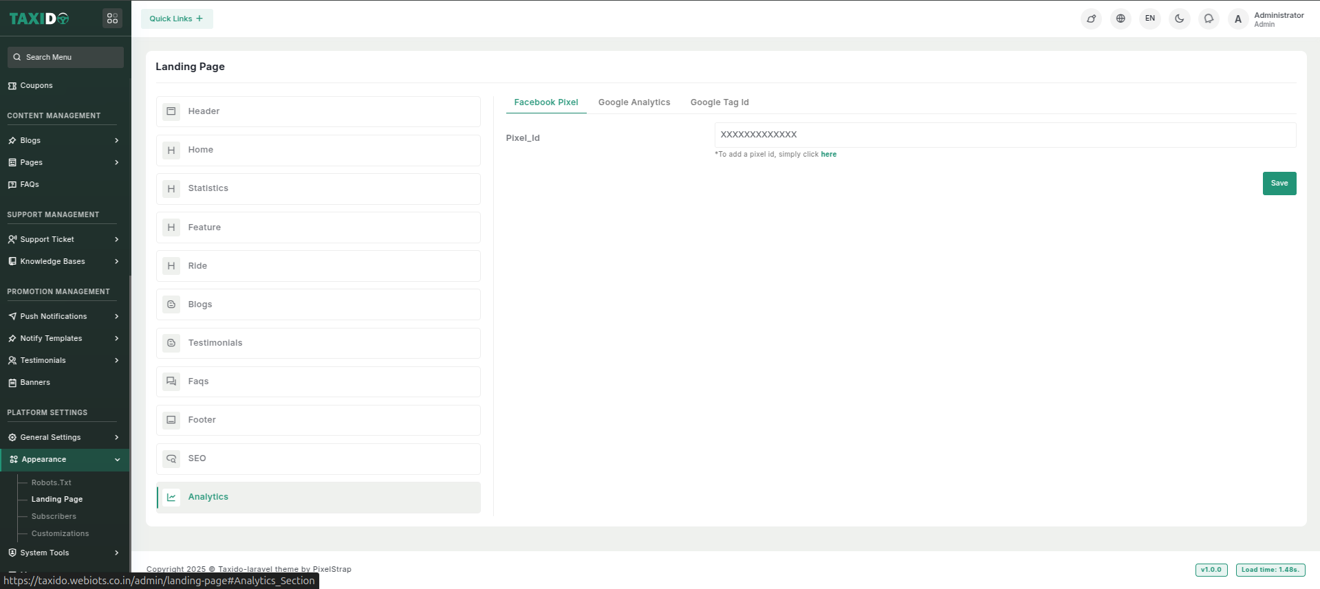 - The Analytics Section in the admin panel allows the admin to manage various tracking codes for the front landing page