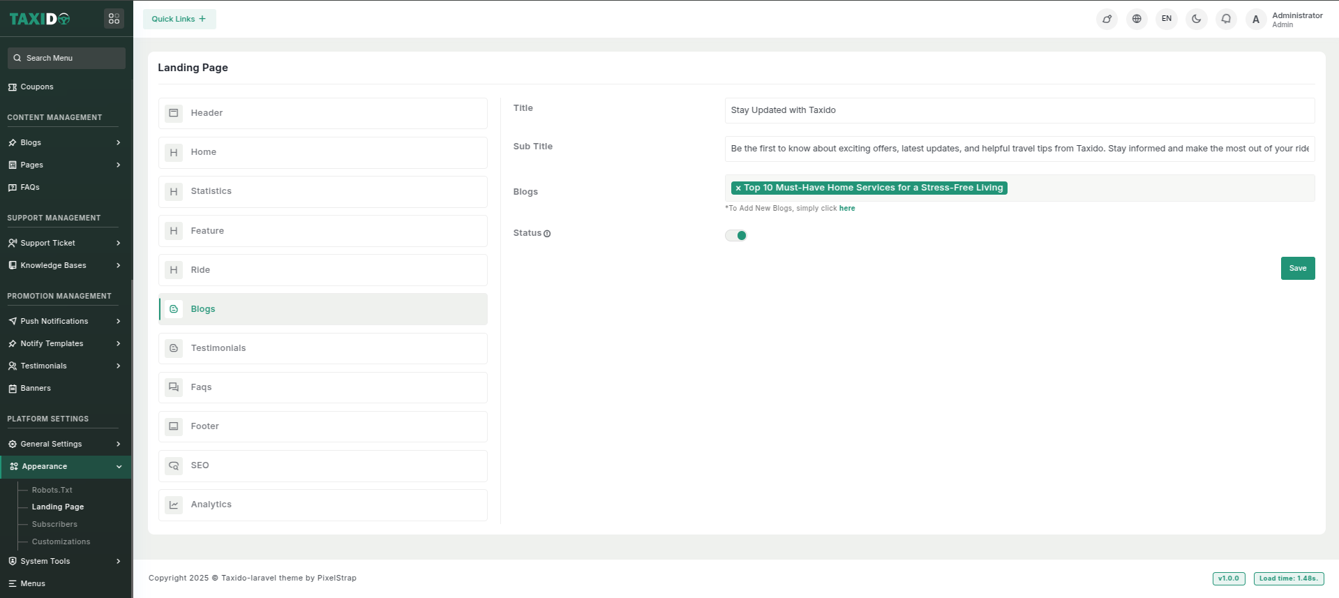 - The Blog Section in the landing page allows the admin to easily manage the title, subtitle and choose blogs from the blogs table to display on the front landing page through a blogs dropdown. The admin can also control the status to show or hide this section on the front landing page.