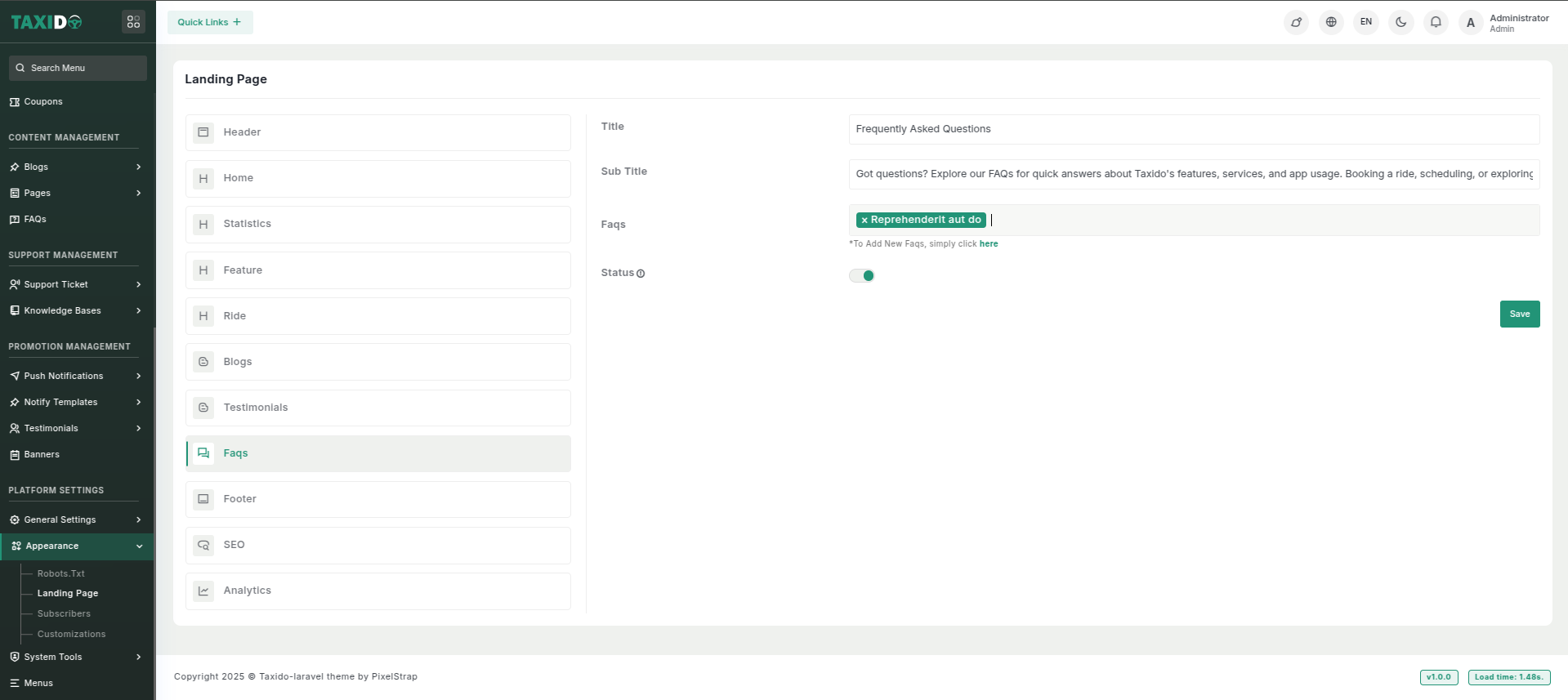 - The FAQ Section in the admin panel enables dynamic management of the title, subtitle and FAQs. The admin can also control the status to show or hide this section on the front landing page.