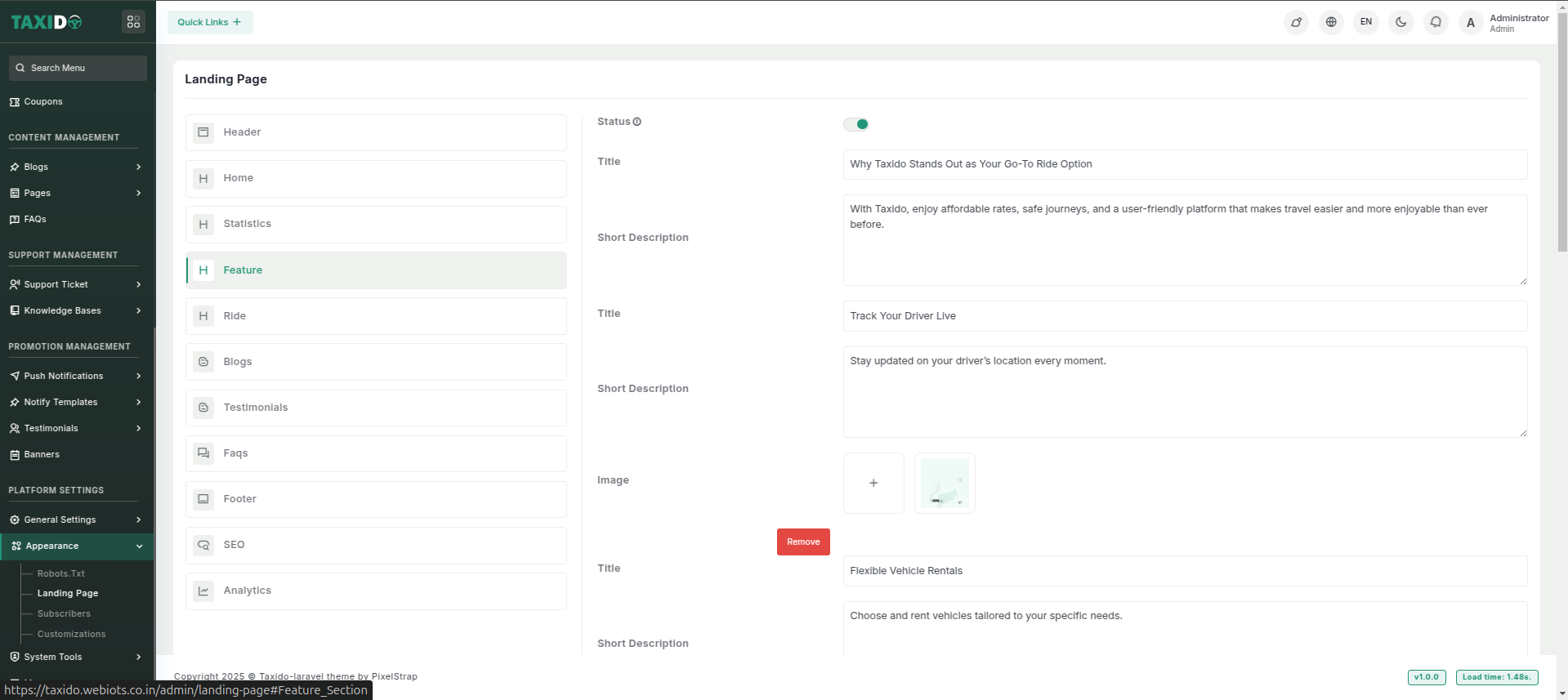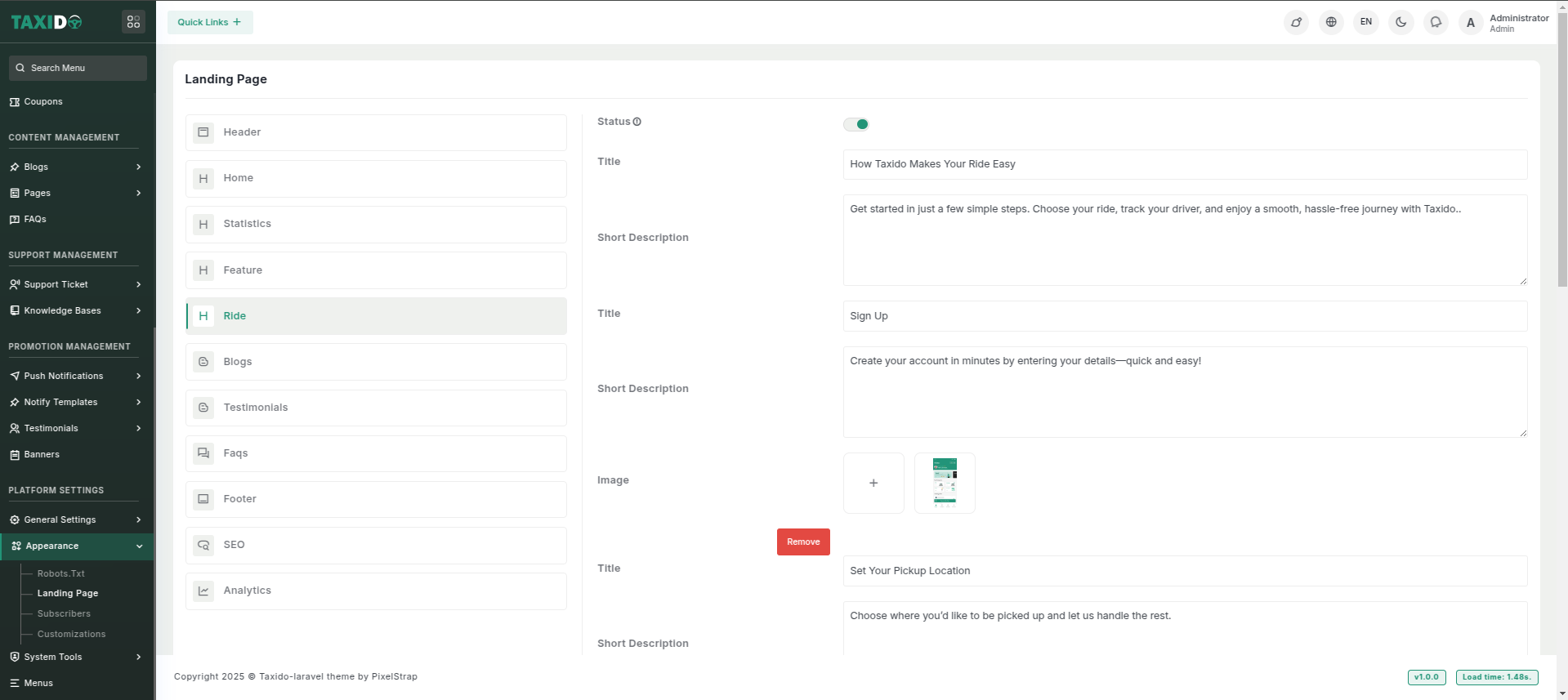 - The Ride Section in the landing page allows the admin to easily manage the title and short description. This section includes a series of ride steps, which the admin to easily manage. Each step comes with customizable fields such as the title, short description, and image, which are displayed on the front-end landing page. The admin can also control the status to show or hide this section on the front landing page.