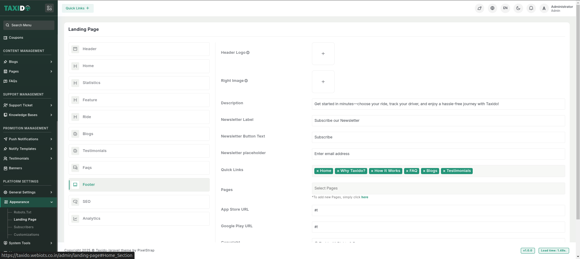 - The Footer Section in the admin panel allows the admin to manage the header logo, right image, description, newsletter label, newsletter button text, newsletter placeholder, quick links, pages, app store URL, google play URL, and copyright, which are reflected on the front-end landing page. The admin can also control the status to show or hide this section on the front landing page.