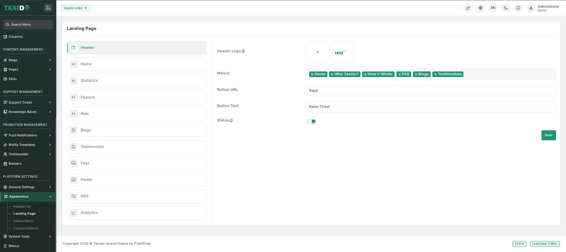 - The Header Section in the landing page lets the admin dynamically manage the header logo, menus, button URL/text, ensuring a customizable front-end experience. The admin can also control the status to show or hide this section on the front landing page.