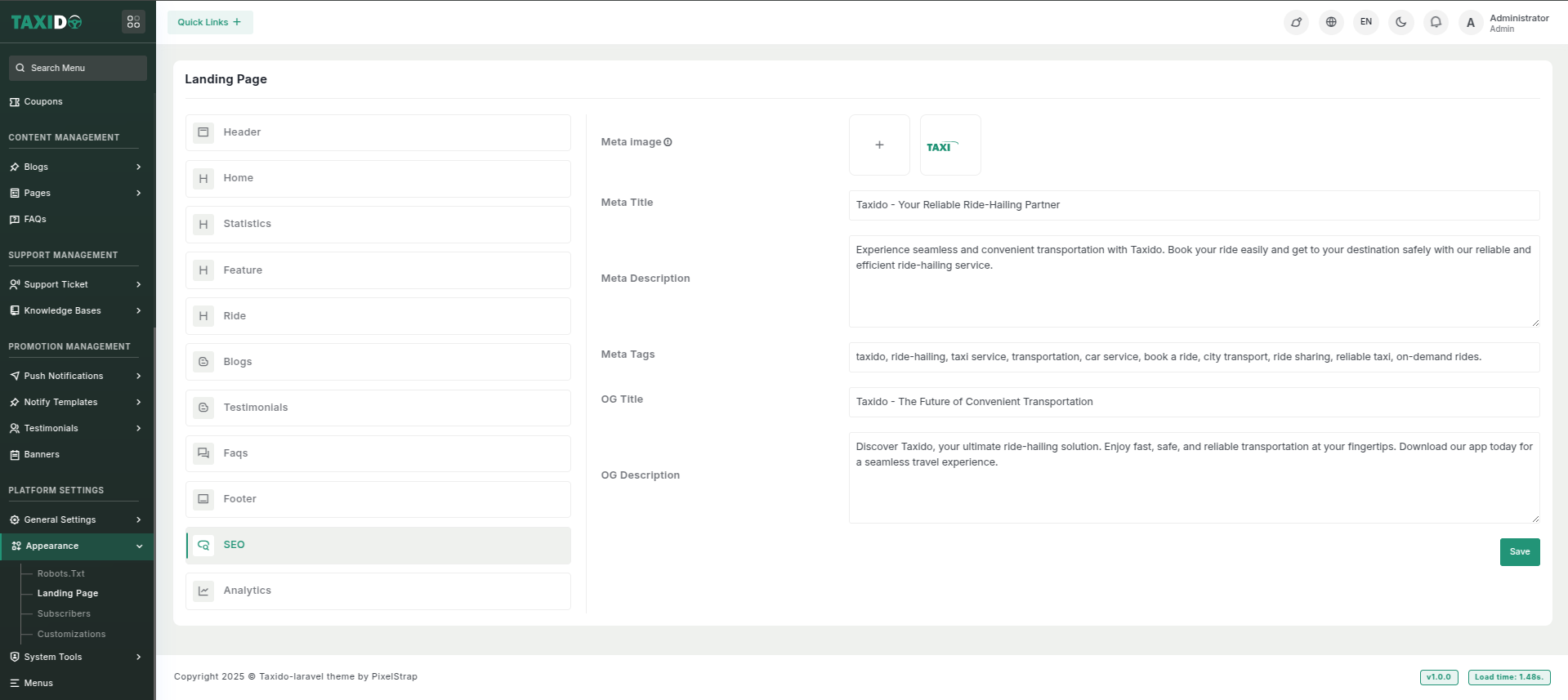 - The SEO Section in the admin panel allows the admin to manage the meta image, meta title, meta description, meta tags, and Open Graph (OG) title and description, ensuring optimized SEO settings for the front landing page.