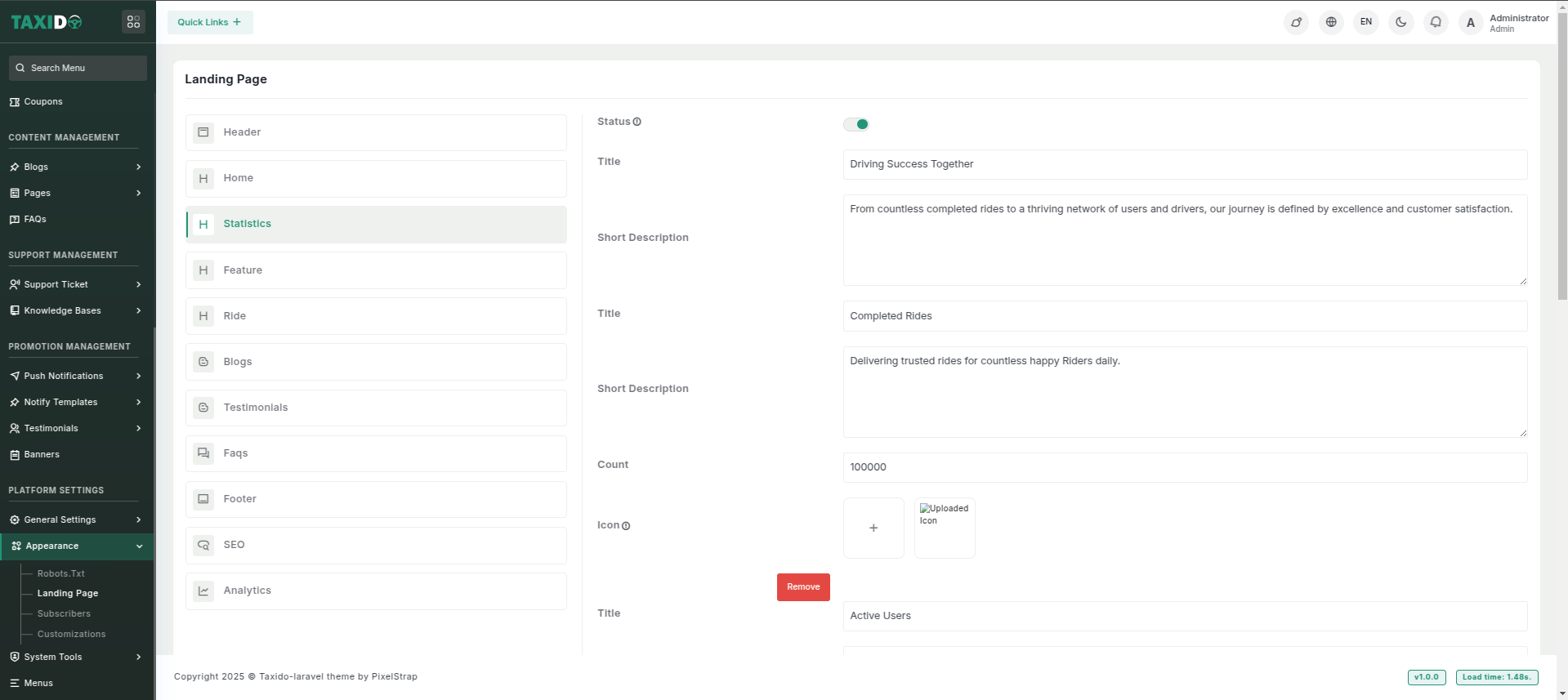 - The Statistics Section in the landing page allows the admin to easily manage the title, short description, and countless boxes. Each countless box includes customizable fields such as the title, short description, count, and icon, which are displayed on the front-end landing page. The admin can also control the status to show or hide this section on the front landing page.