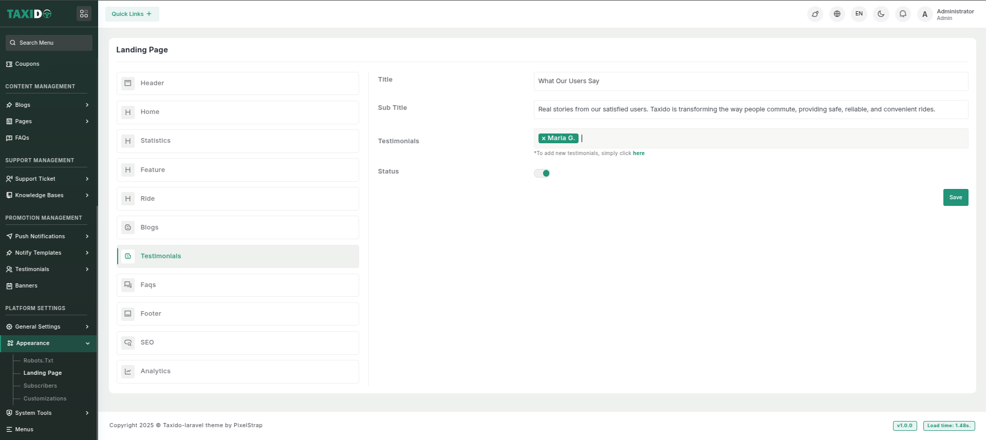 - The Testimonials Section in the admin panel lets the admin manage the title, subtitle, and choose testimonials from the testimonials table to display on the front landing page through a testimonials dropdown. The admin can also control the status to show or hide this section on the front landing page.