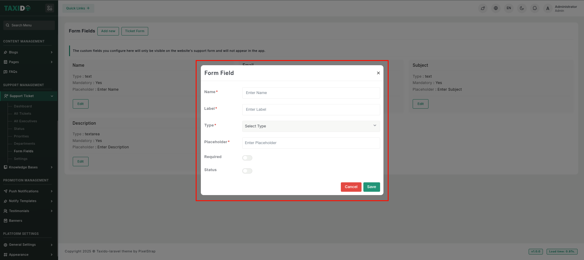 - Required: Set the status to either "Active" or "Inactive." If the status is "Active," this custom field is required while submitting the ticket form. If "Inactive," it will not be required for use.