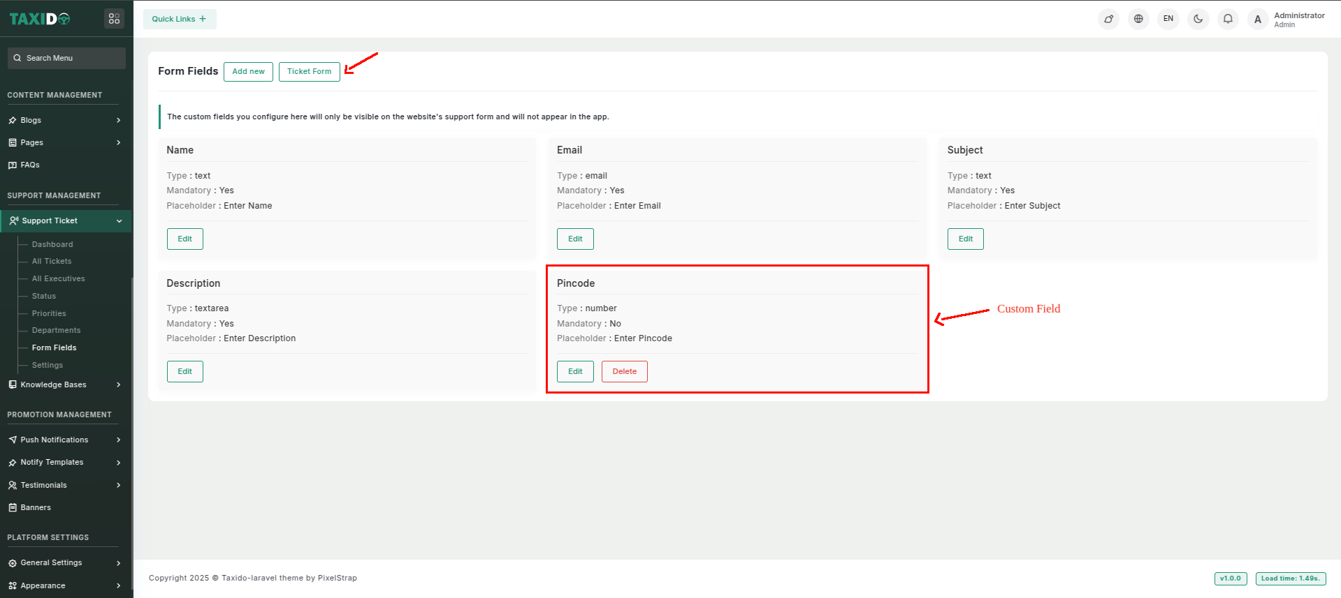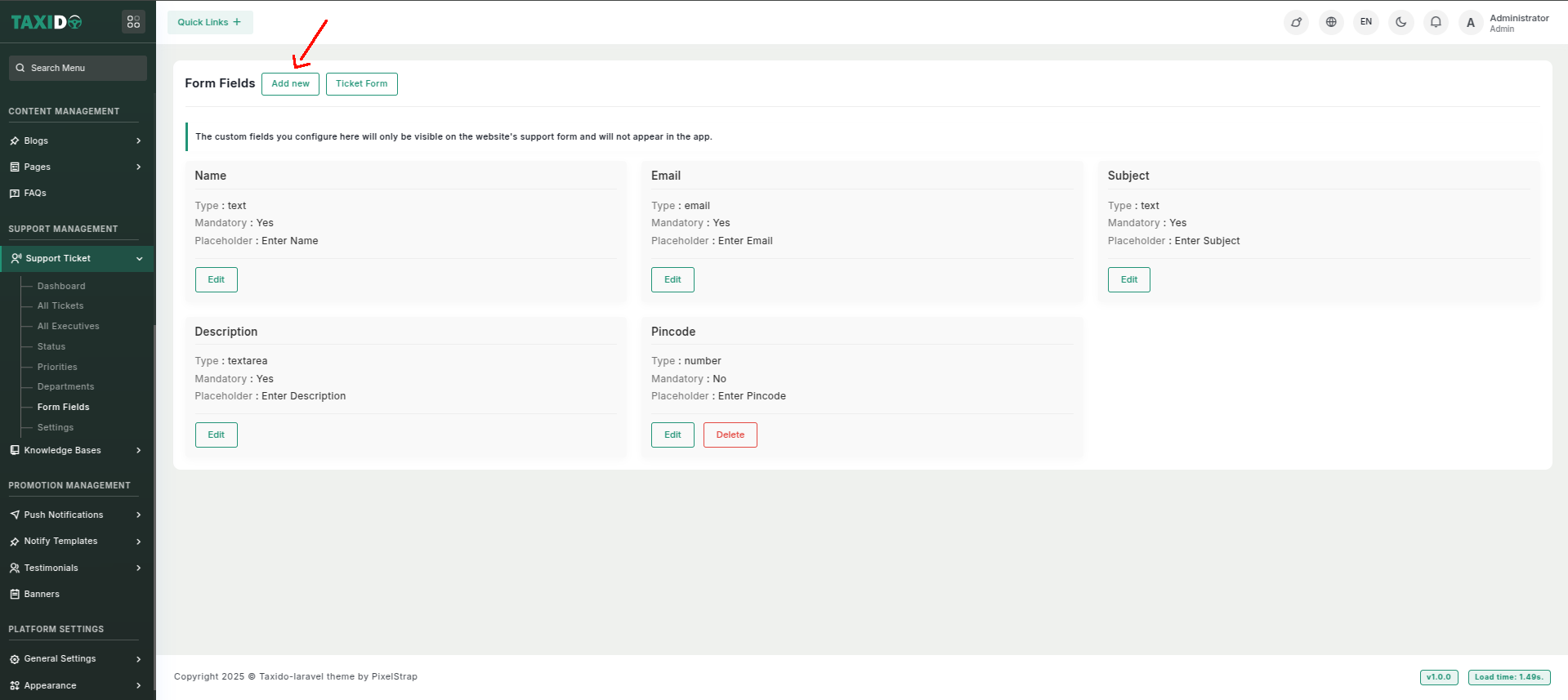 - Click on "Add New" for creating a custom form field