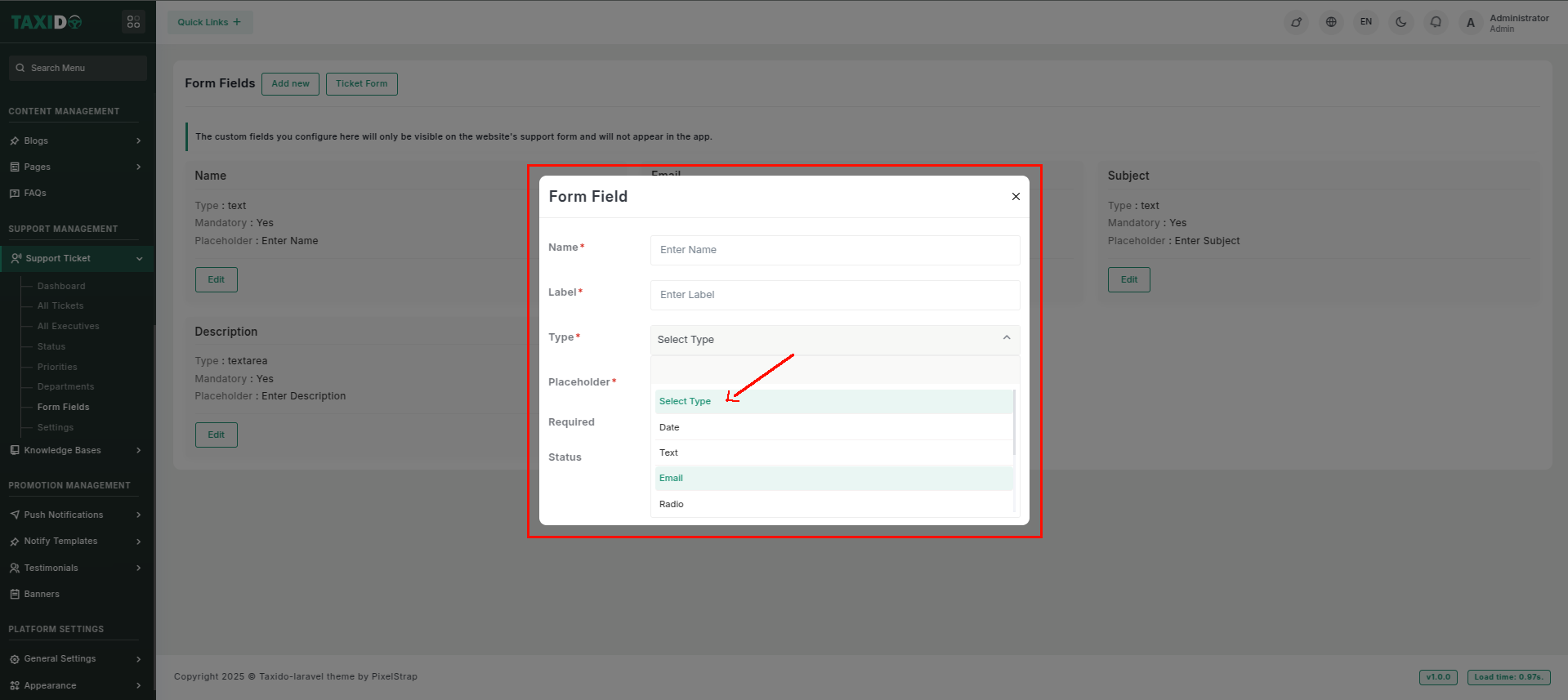 - Type: Select the type, contains date, text, email, radio, number, select, textarea, checkbox.
