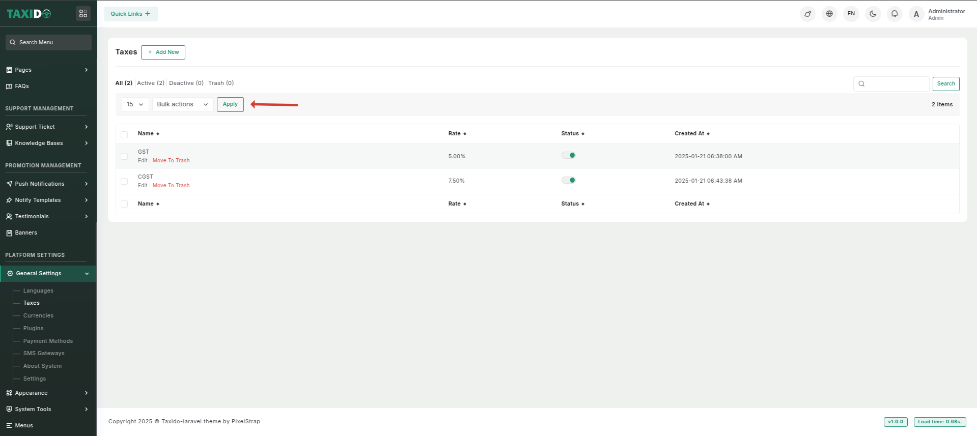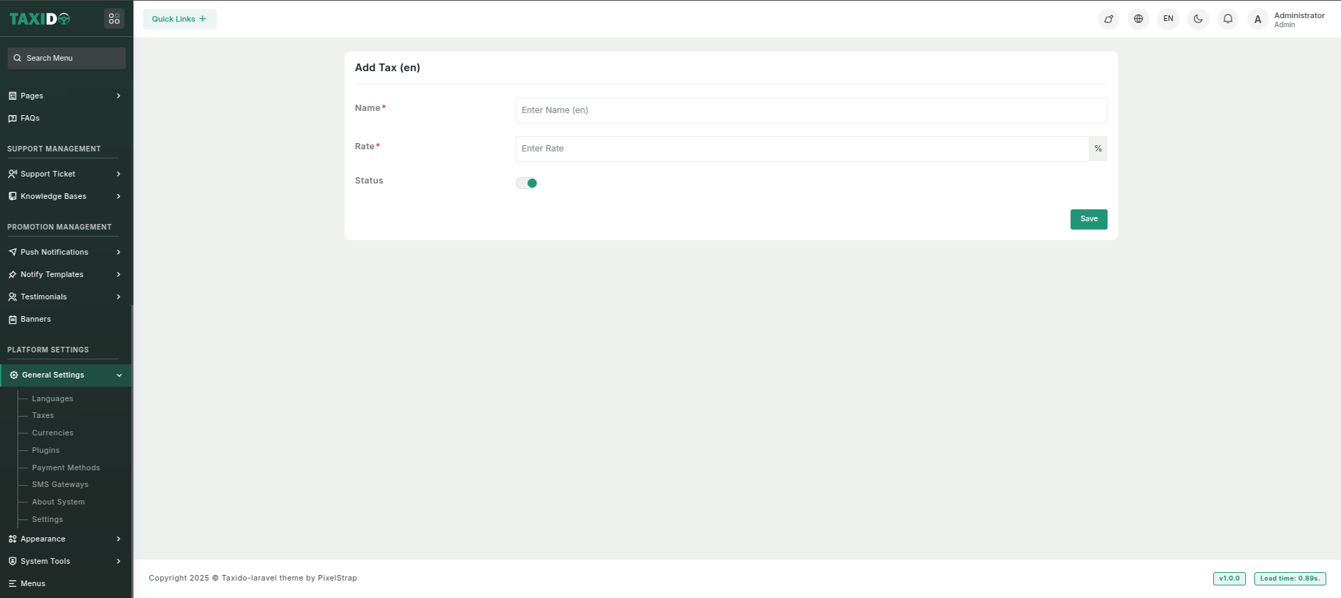 - Status: Toggle this option to activate or deactivate the tax. If enabled, the tax will be active in the system; if disabled, it will not be applied.