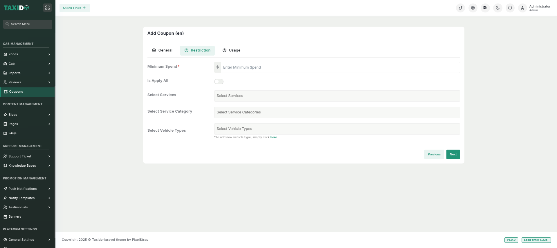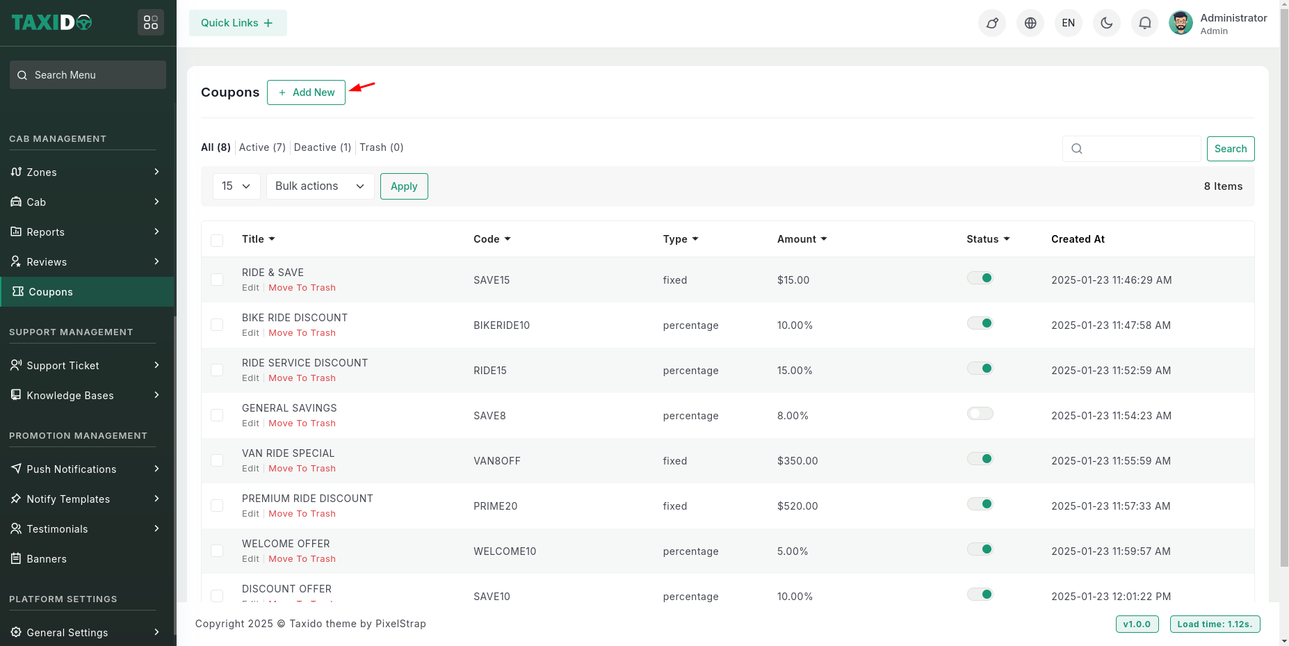 On the admin sidebar, find and click on the Coupons which available on "Cab Management".