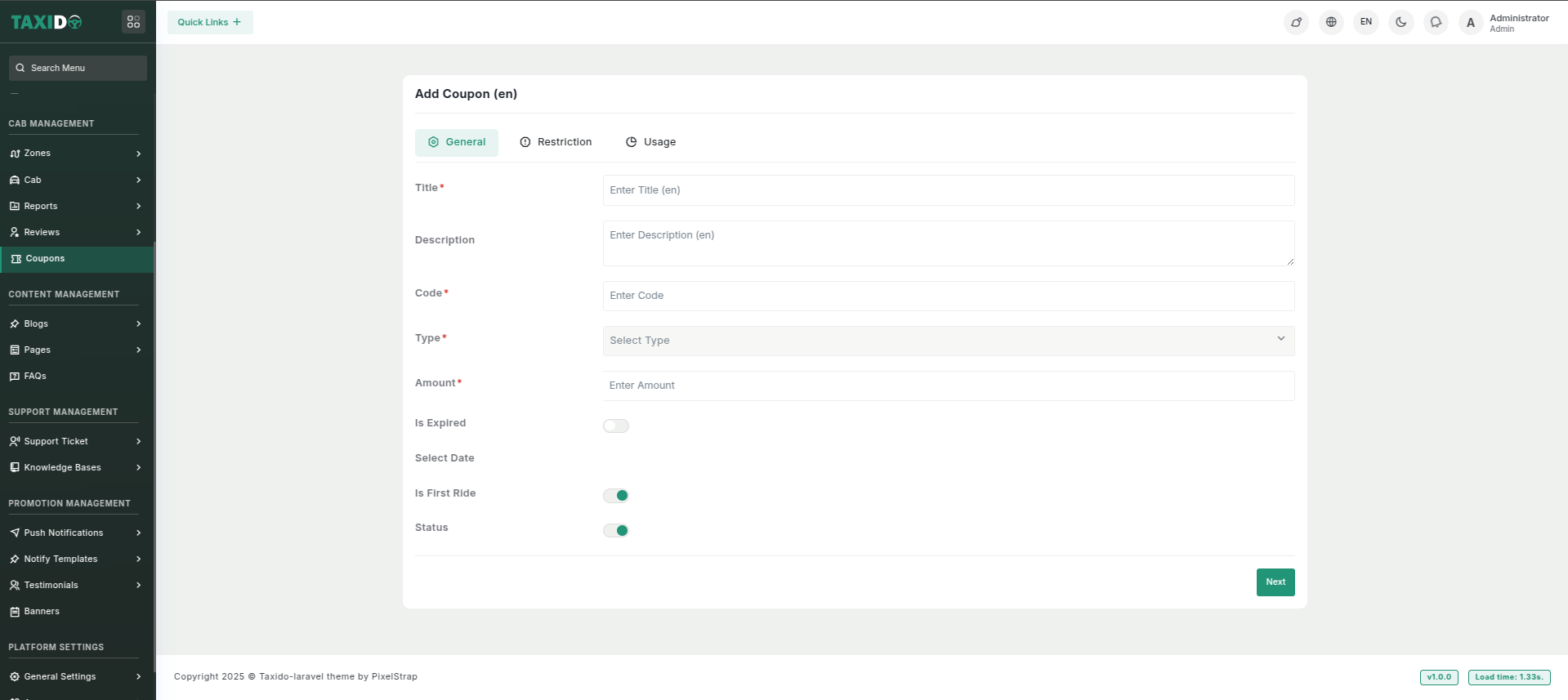 - Is First Ride: This option to activate or deactivate the restriction for the coupon to be valid only on the first ride. If enabled, The coupon can only be used for the user's first ride; if disabled, The coupon can be used without any restrictions.